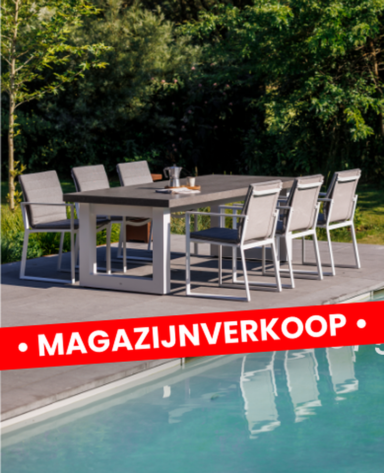 Grijp je kans tijdens onze magazijnverkoop in geselecteerde winkels. Alleen nú profiteer je van kortingen tot 50% op onze hoogwaardige tuinmeubelen en bijzondere samples die je nergens anders vindt.