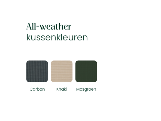 Dankzij hun weerbestendige en waterdoorlatende eigenschappen kunnen All-weather Textileen kussens in alle seizoenen buiten blijven liggen. Zo blijft je set aangekleed en gebruiksklaar – elk moment van het jaar.