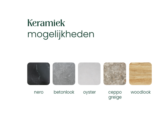 Keramiek en sintered stone zijn sterke, onderhoudsarme materialen die weerbestendig en kleurvast zijn. Ze zijn uitzonderlijk bestand tegen hitte, vlekken en krassen en gaan lang mee. Dankzij een extra glas- en antibacteriële laag biedt keramiek nóg meer stevigheid, hygiëne en bescherming.