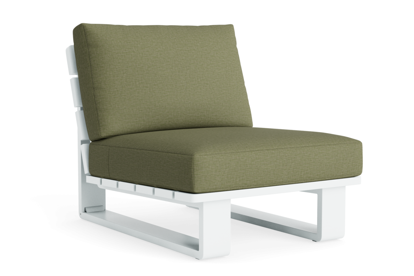 Moderne stoel met lage, schuine zit. Aluminium frame, royale zitting en wieltjes voor flexibiliteit. Te combineren als daybed.