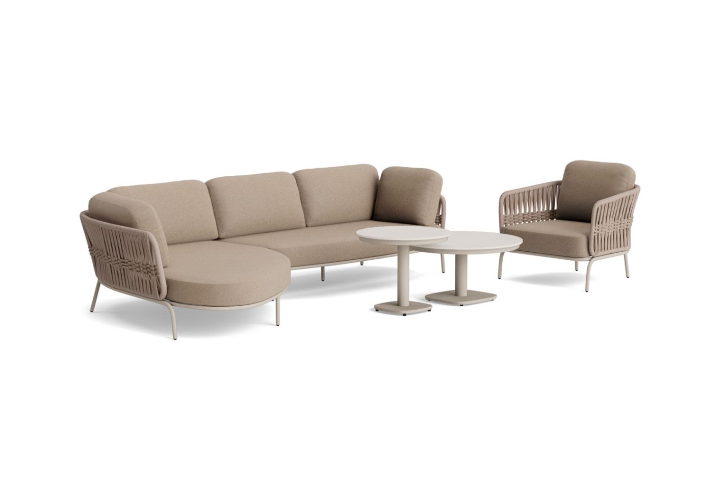 Voor het materiaalgebruik is bewust gekozen voor duurzaamheid en gebruiksgemak. Het aluminium frame is licht, sterk en volledig weerbestendig. De rugleuningen zijn uitgevoerd in beige RuCore touw, een onderhoudsvriendelijk en duurzaam alternatief voor traditioneel vlechtwerk. De zachte All-weather Bouclé kussens in taupe zorgen voor een comfortabele, ondersteunende zit en zijn ontworpen om langdurig buiten te gebruiken.