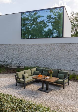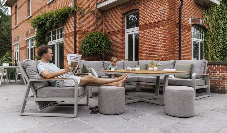 Timber loungeset lava aluminum met mistgrijze All-weather Soltex kussens in moderne tuin Timber loungeset lava aluminum met mistgrijze All-weather Soltex kussens in moderne tuin