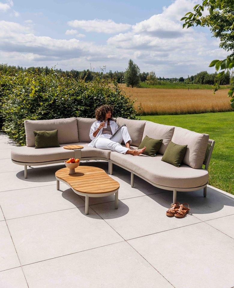 Met zijn volledig organische vormgeving en verfijnde rugleuning van RuCore+ touw is dit een echt sieraad voor je terras. De beige materialen vloeien naadloos in elkaar over, zeker wanneer je kiest voor onze zandkleurige All-weather Bouclé kussens.