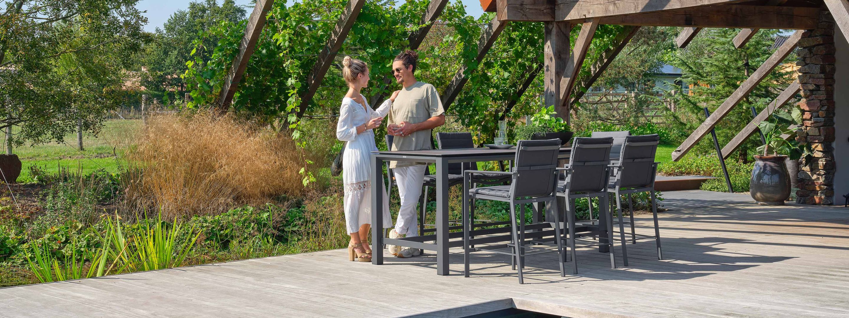 Voor Eliza en Thomas is de tuin dé plek om samen te komen met familie en vrienden. Afgelopen zomer organiseerden ze meerdere barbecues, waaronder een Mediterrane avond die bij iedereen in de smaak viel. "Iedereen bracht iets lekkers mee," vertelt Eliza. "Huisgemaakte tapenades, gegrilde groenten, vis en focaccia stonden op het menu. Met onze bar- en loungeset hadden we genoeg ruimte voor onze groep van twaalf personen om comfortabel samen te genieten." Bij het kiezen van hun tuinmeubelen stond stijl én functionaliteit centraal.