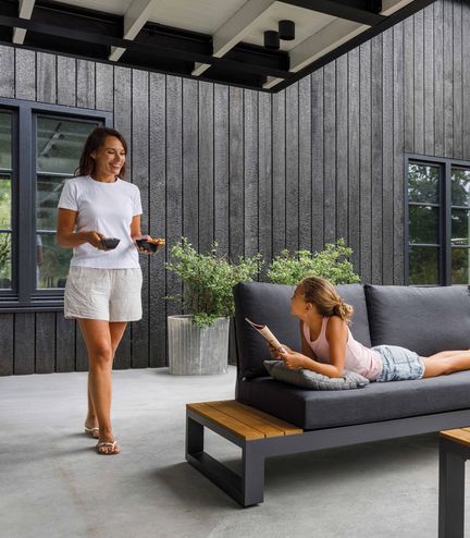 Om de tuin netjes te houden, hebben James en Emily gekozen voor meubels met slimme opbergruimtes. De hoektafel van de loungeset heeft een geïntegreerd aluminium dienblad en een handig opbergvak. Hier bewaren ze spellen en boeken, zodat alles binnen handbereik is, maar de tuin toch opgeruimd blijft.