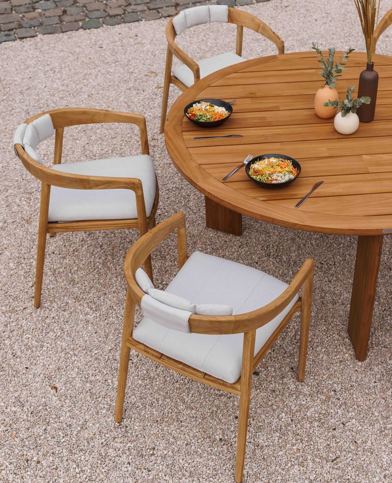 • Contrastrijk tafelen: Zoek je die typische Japandi-mix? De Tondo of Concept tuintafels combineren prachtig hout met een donker aluminium frame. Het is strak, maar door het hout blijft het uitnodigend.