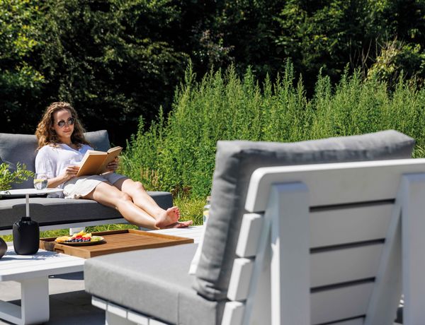 Minimalistische tuinstijl met Timber loungeset in wit aluminium
