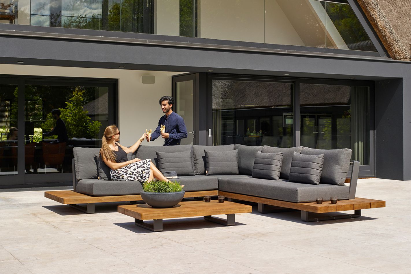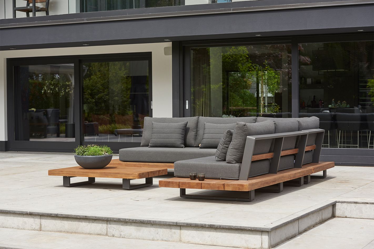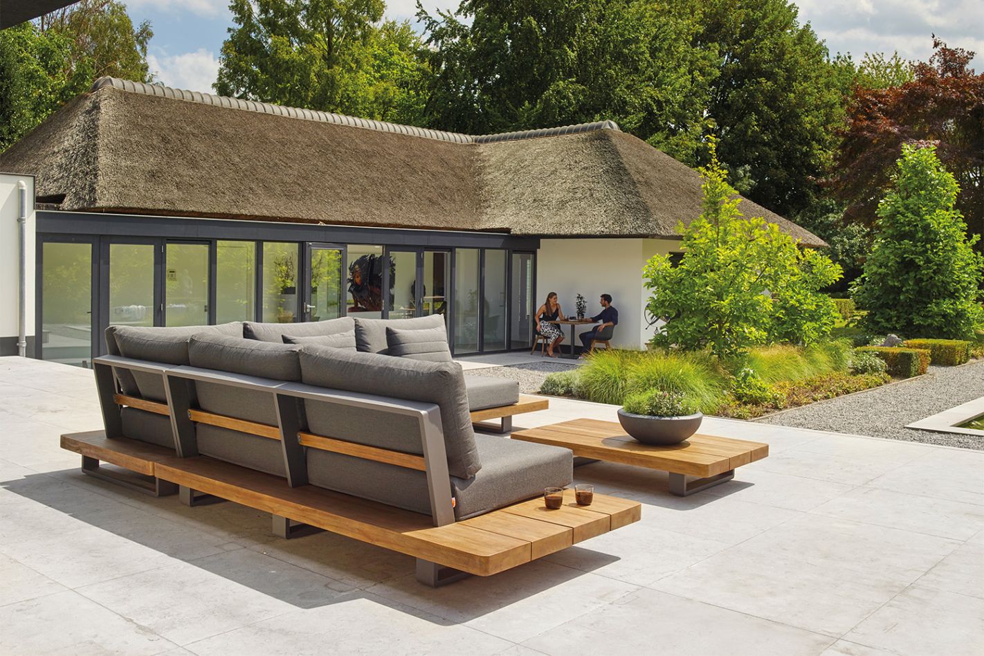 Iconische, luxe loungeset met diepe zit. Robuuste profielen, flexibele opstelling, keuze uit aluminium of teak/aluminium.