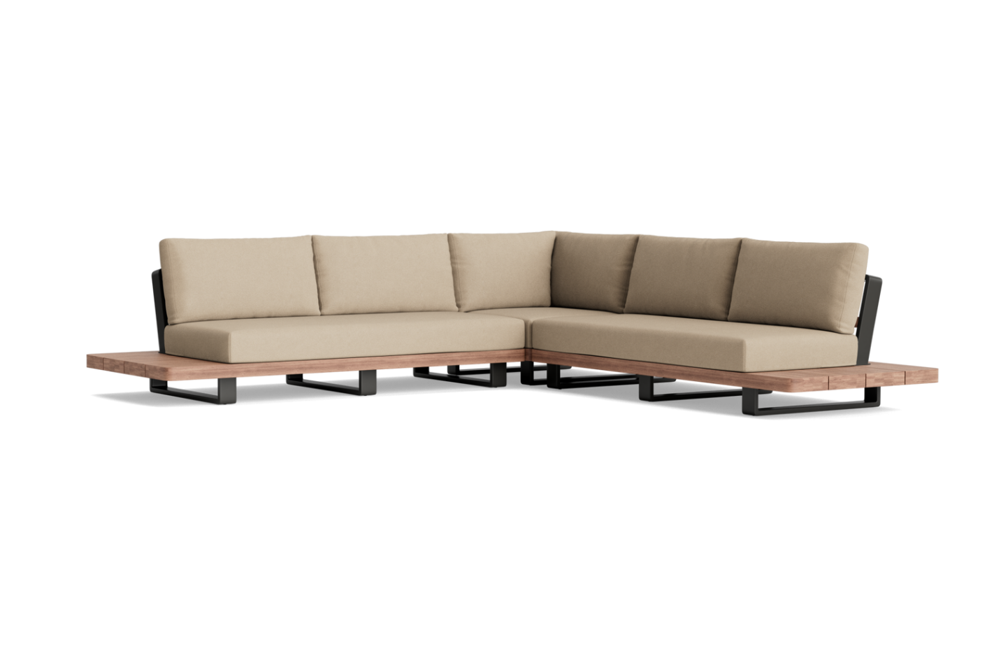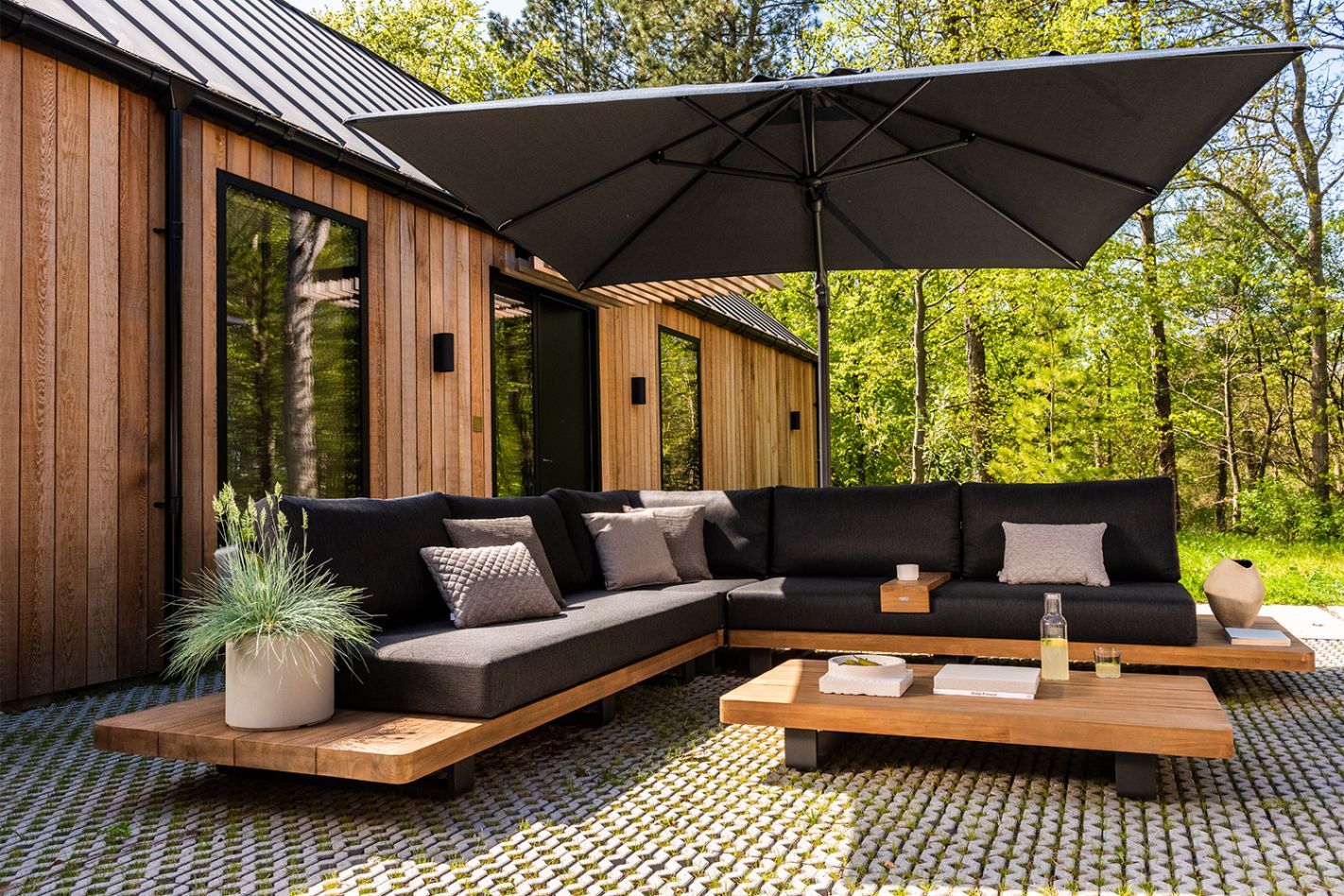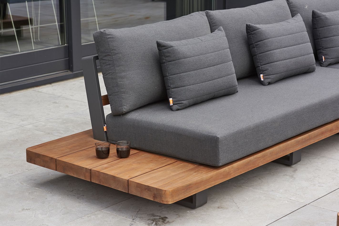 Iconische, luxe loungeset met diepe zit. Robuuste profielen, flexibele opstelling, keuze uit aluminium of teak/aluminium.