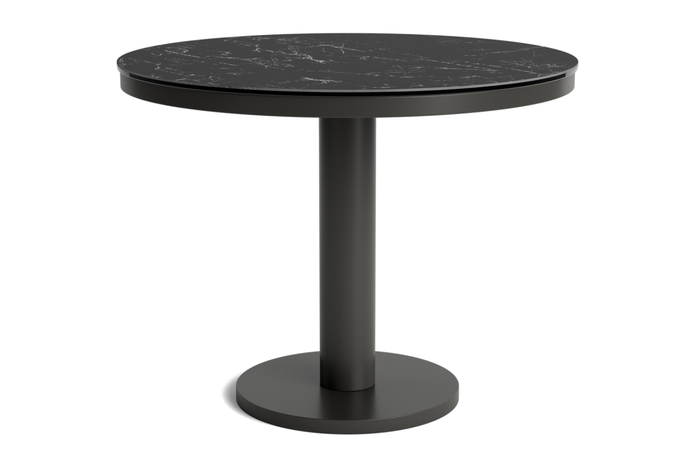 Moderne bartafel met centrale middenpoot voor bewegingsvrijheid. Keuze uit teak of keramiek blad en sterk aluminium frame.