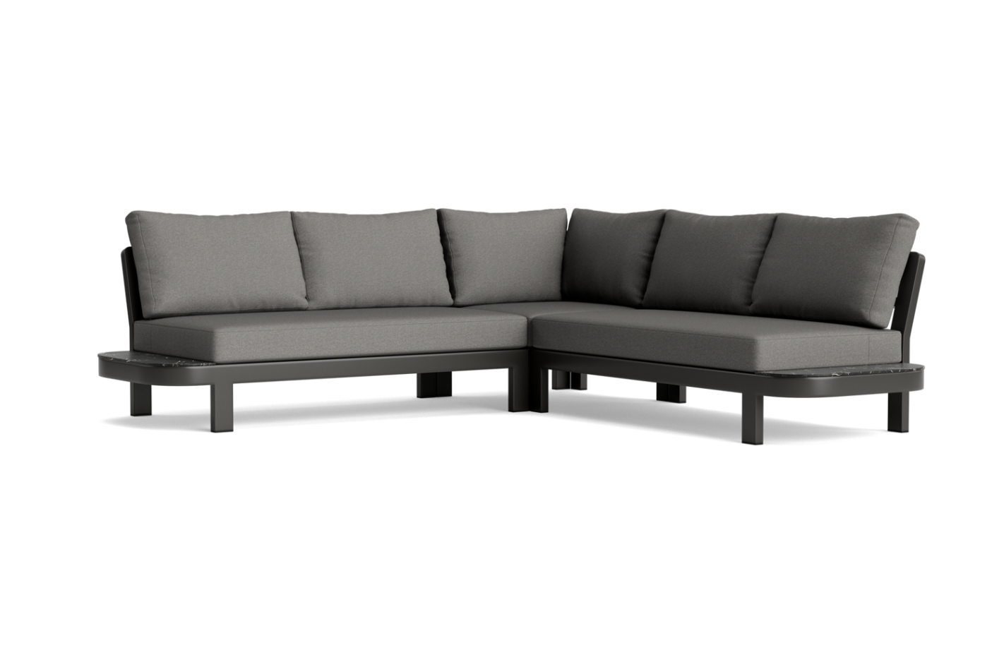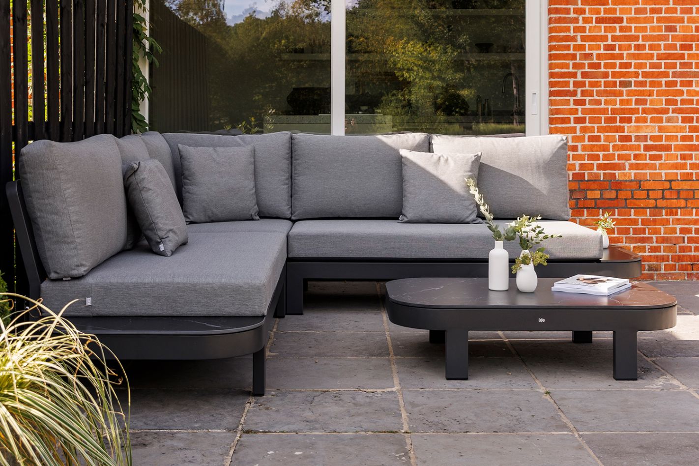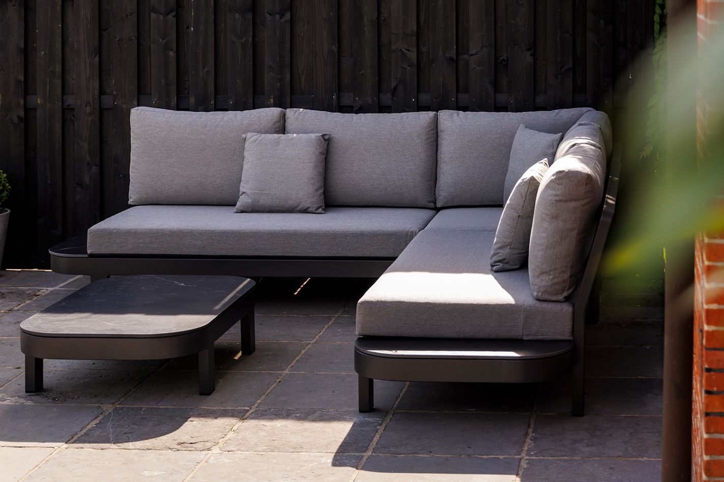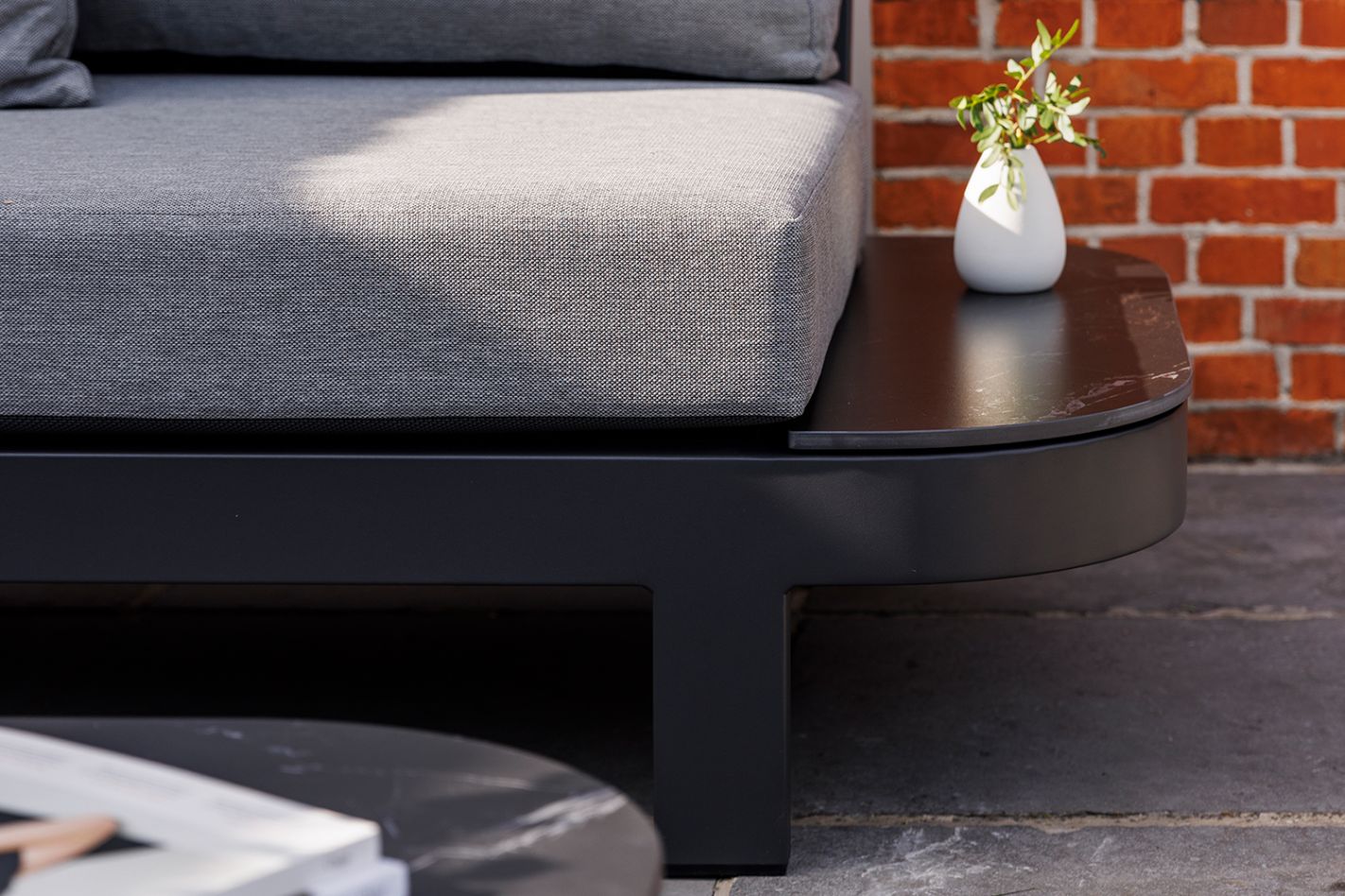 De combinatie van een aluminium frame en een textileen zitting zorgt voor een prettige ondersteuning. Het textileen veert subtiel mee onder de kussens, waardoor je tijdens het zitten extra comfort ervaart in vergelijking met een volledig harde basis. De extra steunbalk in de rug draagt bij aan een stabiele zit, zodat je langere tijd comfortabel blijft zitten. De set is verkrijgbaar in verschillende opstellingen, zoals een hoekbank met geïntegreerde zijtafels of een variant met een chaise longue element.