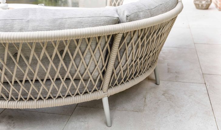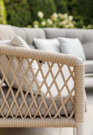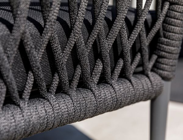 Het design van de Lima loungeserie draait om ronde vormen, luxe materialen en een warme uitstraling. De rug- en armleuningen vloeien naadloos in elkaar over, afgewerkt met een vlechtwerk van het innovatieve RuCore+ touw. Dankzij de rubberen foamkern is dit touw niet alleen dikker en comfortabeler, maar ook sneldrogend en onderhoudsvriendelijk.