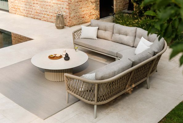 De zachte kussens, herkenbaar aan hun ronde hoek en subtiele knoopdetails, zorgen voor een uitnodigend zitcomfort. Het ronde frame en de elegante poten maken het geheel compleet. Verkrijgbaar in beige en lava, voor een stijlvolle en eigentijdse buitenruimte.
