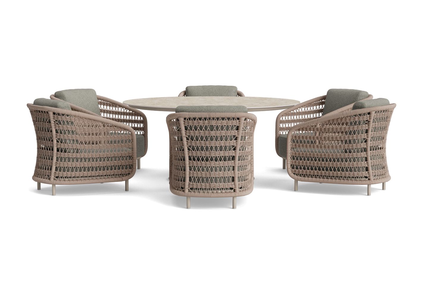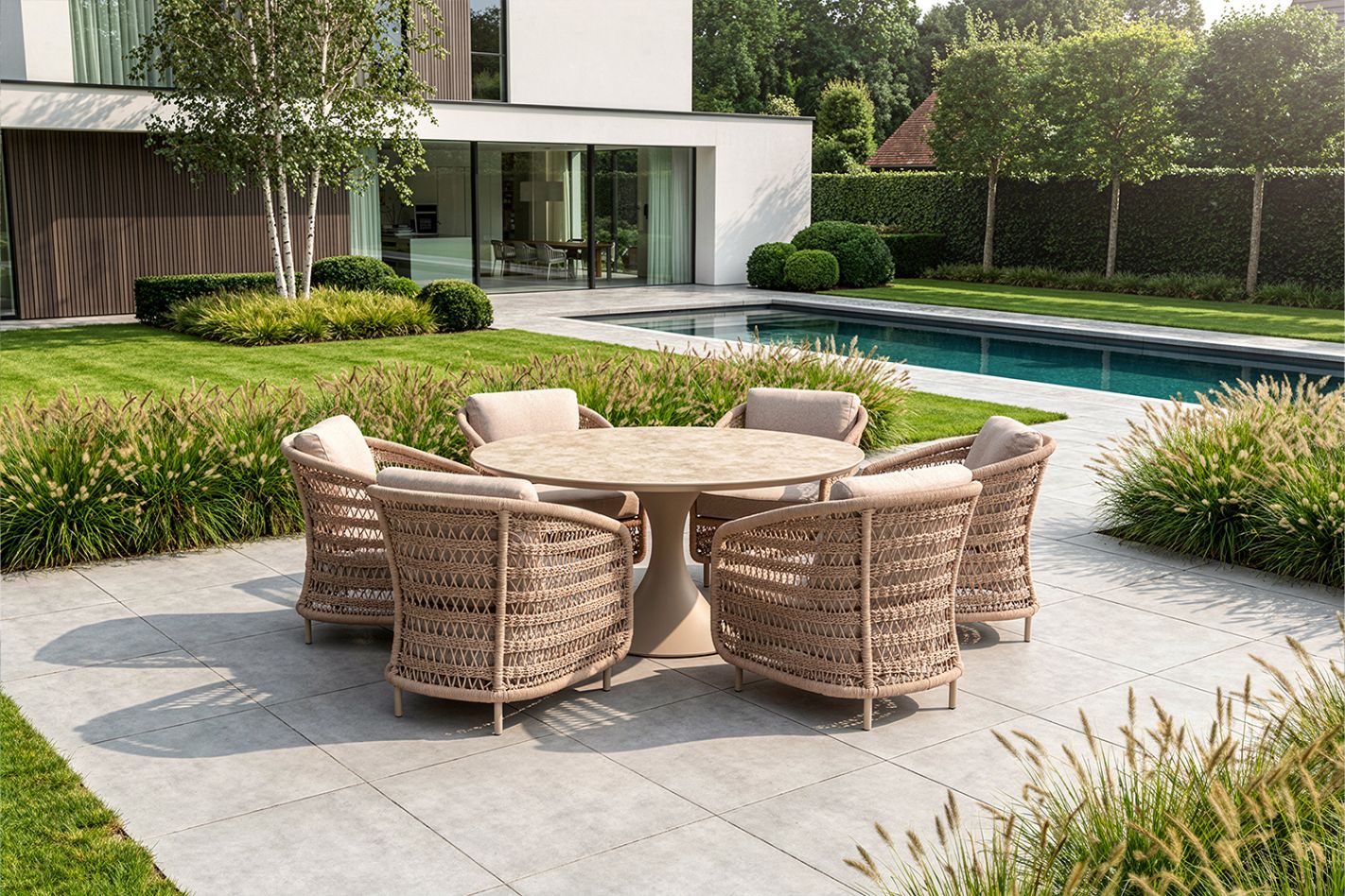 De set bestaat uit een ronde low dining tafel met een diameter van 160 cm en zes ruime low dining stoelen. Het keramische tafelblad vormt een sterk en stijlvol middelpunt en is ontworpen voor intensief gebruik buiten. Keramiek is krasvast, kleurvast en bestand tegen hitte en weersinvloeden, waardoor de tafel seizoen na seizoen zijn verfijnde uitstraling behoudt. Het ronde blad stimuleert interactie en maakt elk diner vanzelfsprekend sociaal en ontspannen.