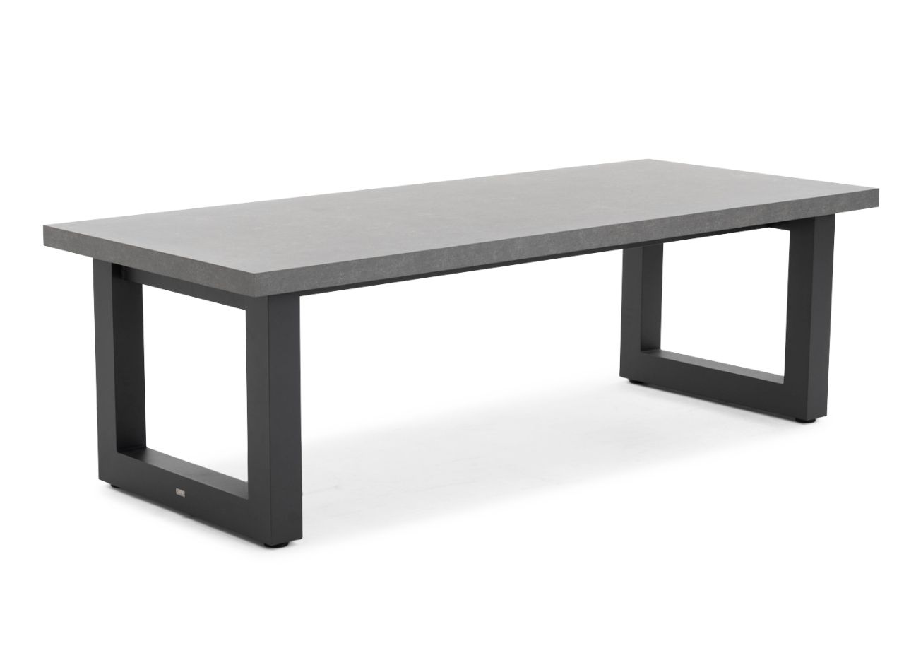 Krachtige, moderne tafel. Robuust aluminium frame met dik keramisch blad in betonlook. Solide en stijlvol.