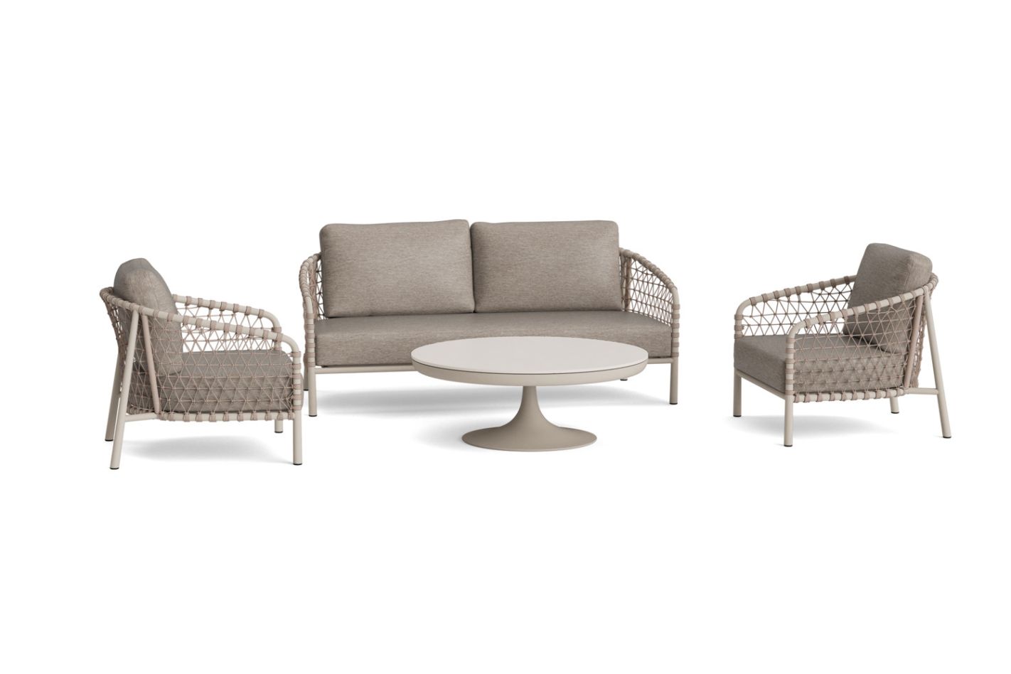 Das Set besteht aus einer festen Anordnung mit einem Sofa, zwei Relaxsesseln und einem runden Couchtisch mit einem Durchmesser von 110 cm. Die drehbare Tischplatte aus Sinterstein ermöglicht es, Getränke und Snacks jederzeit bequem zu erreichen. Das Aluminiumgestell, das langlebige RuCore-Geflecht sowie die pflegeleichten Materialien machen die Como ideal für den langfristigen Einsatz im Außenbereich.