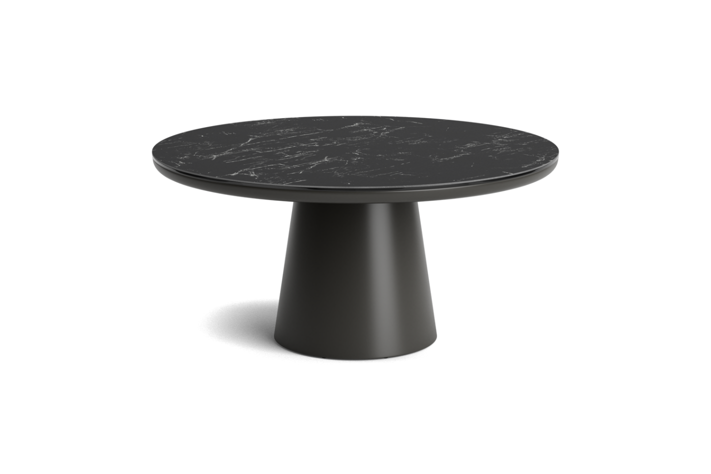 Runder Tisch mit Säulenfuß (gute Beinfreiheit). Aluminiumgestell und wahlweise Keramik- oder Teakholzplatte.
