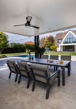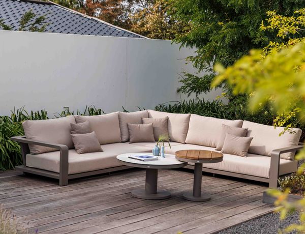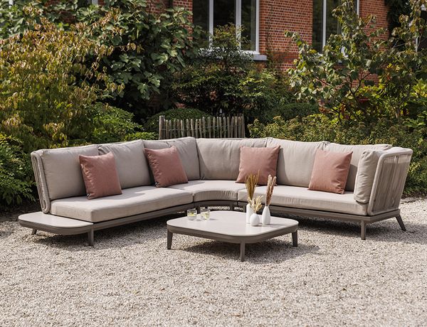 Neu – und unserer Meinung nach ein echter Dauerbrenner – ist die Aluminiumrahmenfarbe Taupe. WƤhrend Beige bereits in den vergangenen Jahren prƤsent war, bringt Taupe eine etwas dunklere, luxuriƶsere Tiefe mit sich. Diese edle Nuance verleiht Gartenmƶbeln einen eleganten Look, der sich wunderbar mit dem Grün im Aussenbereich verbindet. Diese Trendfarbe zeigt sich in unseren neuesten Modellen wie den Loungesets Alpes und Everest, aber auch beliebte Klassiker wie Orleans erstrahlen jetzt in diesem warmen Gewand.