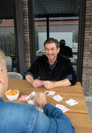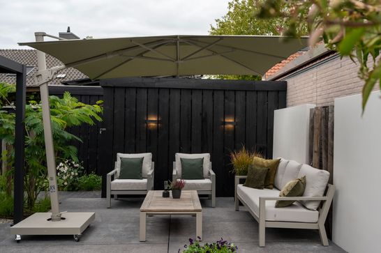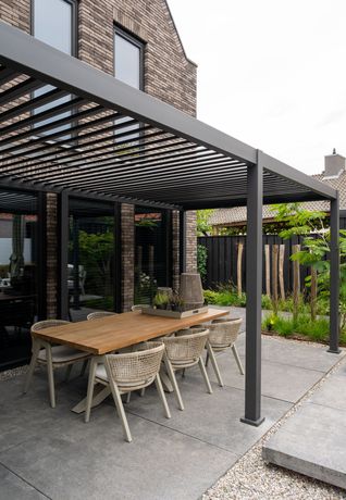 Die Wahl für beiges Aluminium war bewusst. ā€žEs ist mal etwas anderes und passt perfekt zu den grauen Bodenplattenā€œ, erklƤrt Bert. ā€žUnd es harmoniert auch wunderbar mit den Farben im Haus – dort arbeiten wir viel mit den Rijks-Farben. Der Garten fühlt sich für uns wirklich wie eine Erweiterung des Wohnraums an.ā€œ Auch Pflegeleichtigkeit und Langlebigkeit spielten bei der Auswahl eine große Rolle.