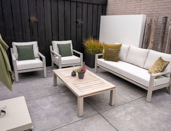 Für den Lounge-Bereich entschieden sie sich für das Timber Loungeset – bestehend aus einem 3-Sitzer-Sofa und zwei einzelnen Lounge-Sesseln aus beigem Aluminium.