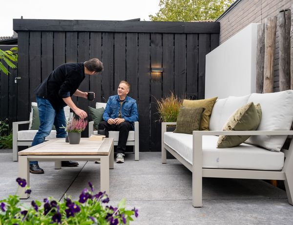 Als Marco und Bert ihr Haus kauften, bestand der Garten hauptsächlich aus Holzplanken und ein paar abgestorbenen Pflanzen. Doch das änderte sich schnell. Gemeinsam mit einem Gartenbauer entwarfen sie ihren neuen Außenbereich: modern, mit großen grauen Betonplatten, Kies, einer Überdachung aus Aluminium und klar definierten Sitzbereichen.