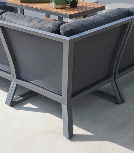 Eine luxuriöse Gartenmöbellinie mit abgerundetem Design, Aluminiumgestellen in Lava oder Beige und Akzenten aus Teakholz. Die Sling-Sitzflächen mit verstellbaren Rückenlehnen bieten Komfort und Funktionalität.
