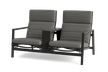 Geradliniges Loungeset mit hoher Sitzhöhe, schlankem Aluminiumgestell und hohem Tisch – ideal zum Loungen und Dinieren im Freien.