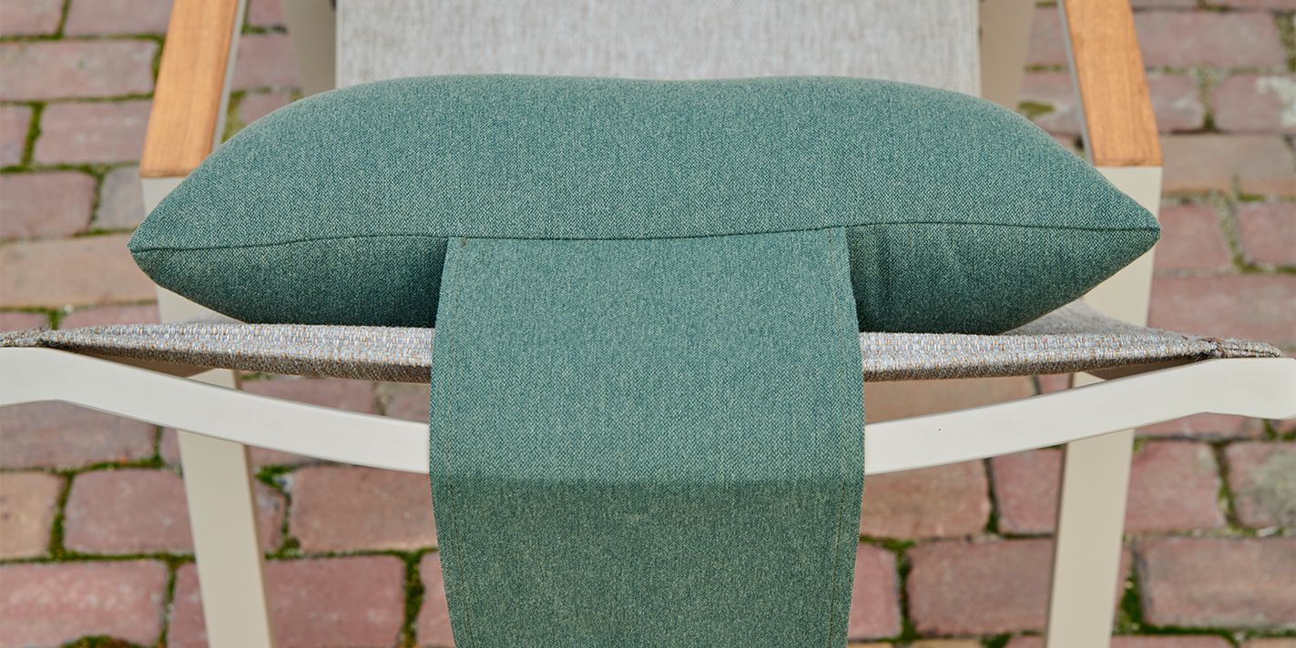 All-weather Textilene ist der wetterbeständigste und pflegeleichteste Stoff in unserer Kollektion. Sie können die Kissen bedenkenlos das ganze Jahr über draußen lassen – allerdings sind sie etwas weniger weich.