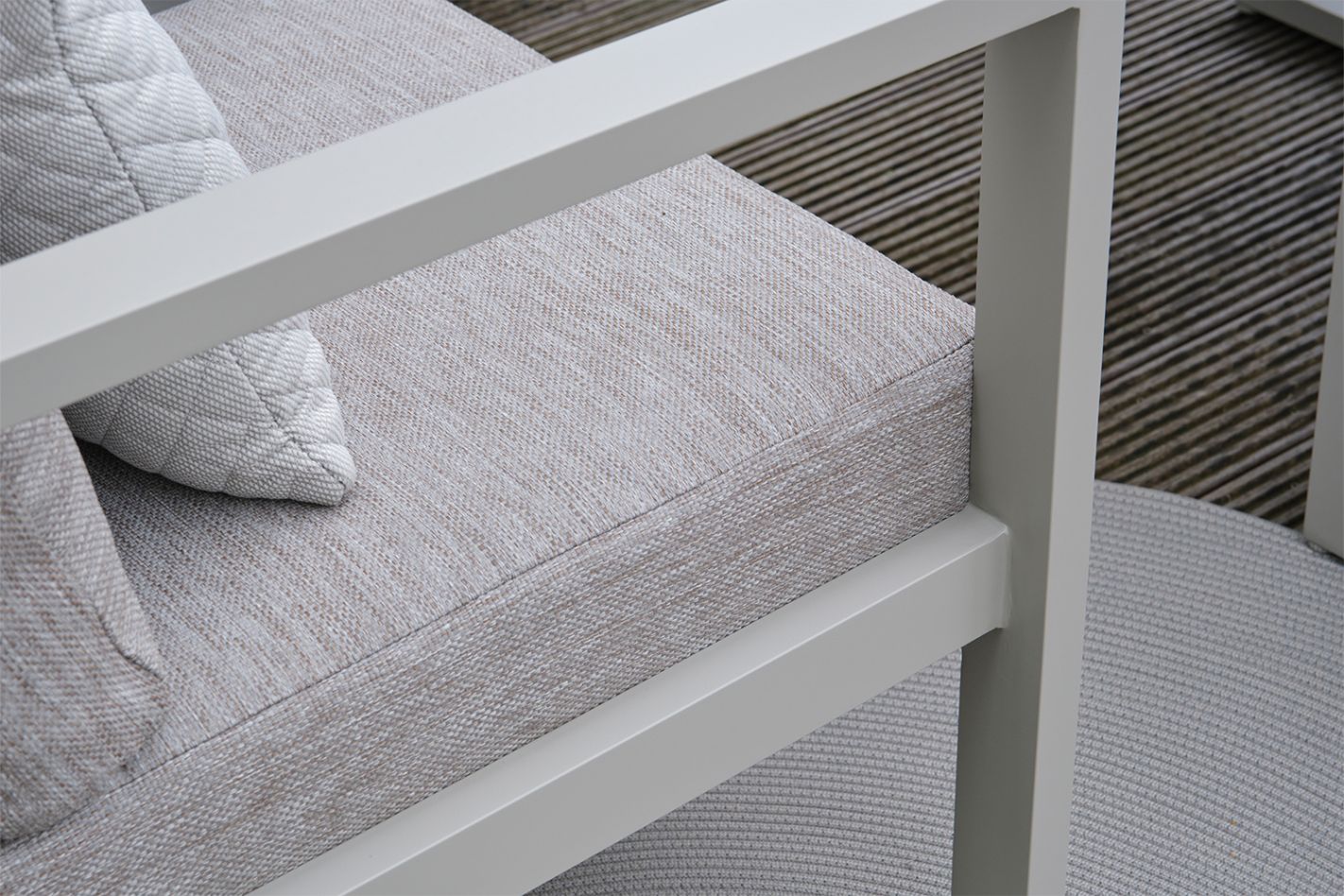 Das Lounge-Set Orleans ist in drei stilvollen Farbkombinationen erhältlich: beiges Gestell mit beigen Kissen, weißes Gestell mit nebelgrauen Kissen und lavafarbenes Gestell mit nebelgrauen Kissen. Alle Kissen sind aus All-weather Soltex gefertigt, einem luxuriösen, wasserdurchlässigen und fleckenabweisenden Material, das sich weich und angenehm anfühlt.