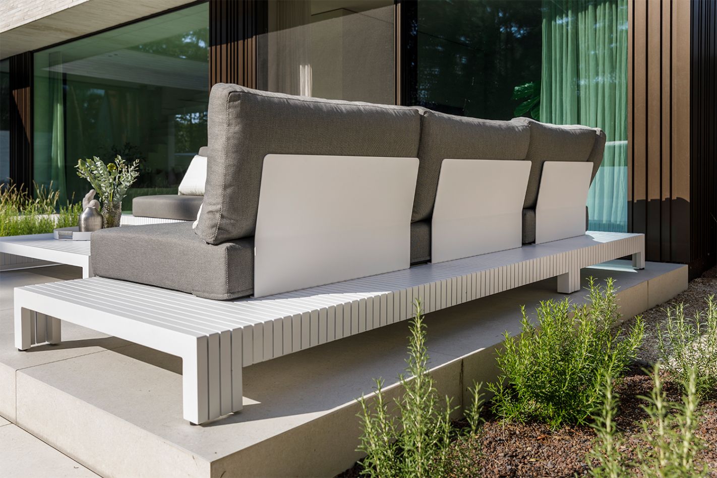 Eines der markantesten Merkmale von Zagros ist der Rhythmus der Aluminiumlamellen, die sich sowohl an der Vorder- als auch an der Rückseite des Rahmens wiederholen. Diese klare Linie verleiht dem Set einen modernen und minimalistischen Look. Der Rahmen besteht vollständig aus Aluminium, was nicht nur ein zeitloses und elegantes Design bietet, sondern auch maximale Witterungsbeständigkeit garantiert.