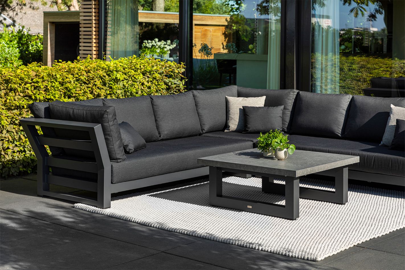 Großzügige, luxuriöse Lounge-Garnitur mit tiefen Sitzflächen und XXL-Kissen. Stabiles Aluminiumgestell mit Teakholz-Couchtisch.