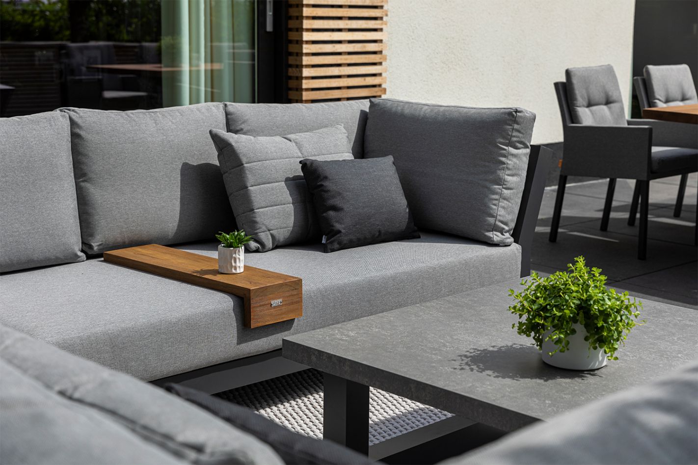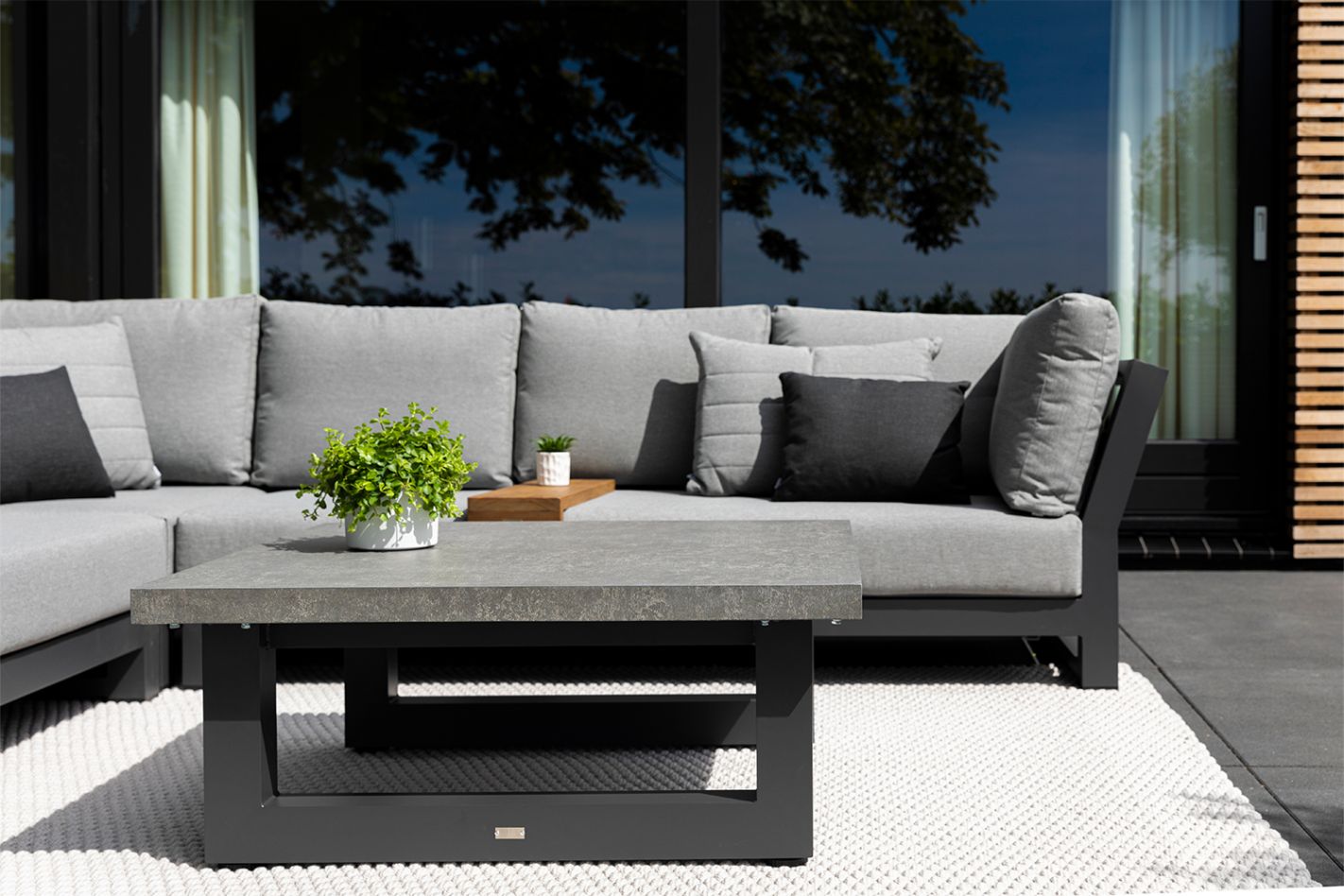 Das Nevada Lounge-Set strahlt Luxus aus, nicht nur durch seine großzügigen Abmessungen, sondern auch durch die Auswahl hochwertiger Materialien. Das Gestell besteht vollständig aus Aluminium, einem leichten und rostfreien Material, das verschiedenen Witterungsbedingungen standhält. Dadurch ist das Set langlebig und pflegeleicht – perfekt für den langfristigen Einsatz im Freien. Das Set wird durch den passenden Nevada Couchtisch mit einer Tischplatte aus dicken Teakholzplanken perfekt ergänzt. Dies verleiht dem Set eine warme und natürliche Note, während die robuste Konstruktion eine lange Lebensdauer garantiert.