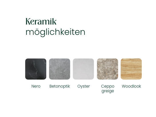 Keramik und Sintered Stone sind robuste, pflegeleichte Materialien, die wetterfest und farbbeständig sind. Sie sind außergewöhnlich widerstandsfähig gegenüber Hitze, Flecken und Kratzern und zeichnen sich durch eine lange Lebensdauer aus. Dank einer zusätzlichen Glas- und antibakteriellen Beschichtung bietet Keramik noch mehr Stabilität, Hygiene und Schutz.