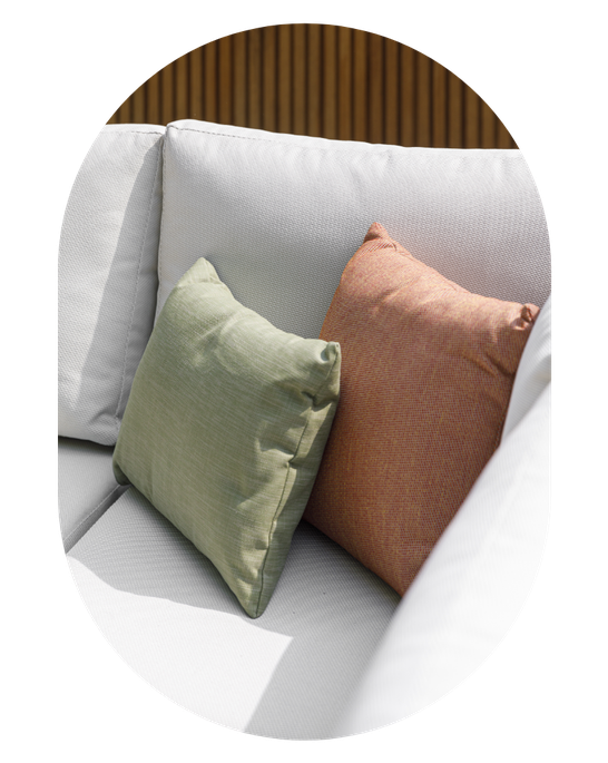 Die Weichheit von Textil kombiniert mit den Vorteilen synthetischer Materialien. Diese wasser- und schmutzabweisenden Kissen können im Frühling und Sommer auch bei einem Regenschauer draußen bleiben. Für eine längere Lebensdauer empfehlen wir, sie im Herbst und Winter drinnen zu lagern.