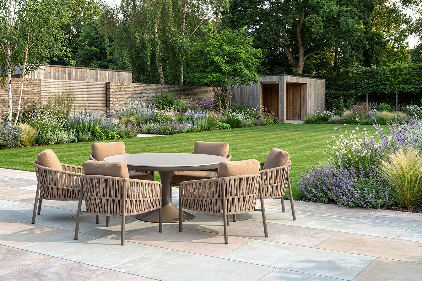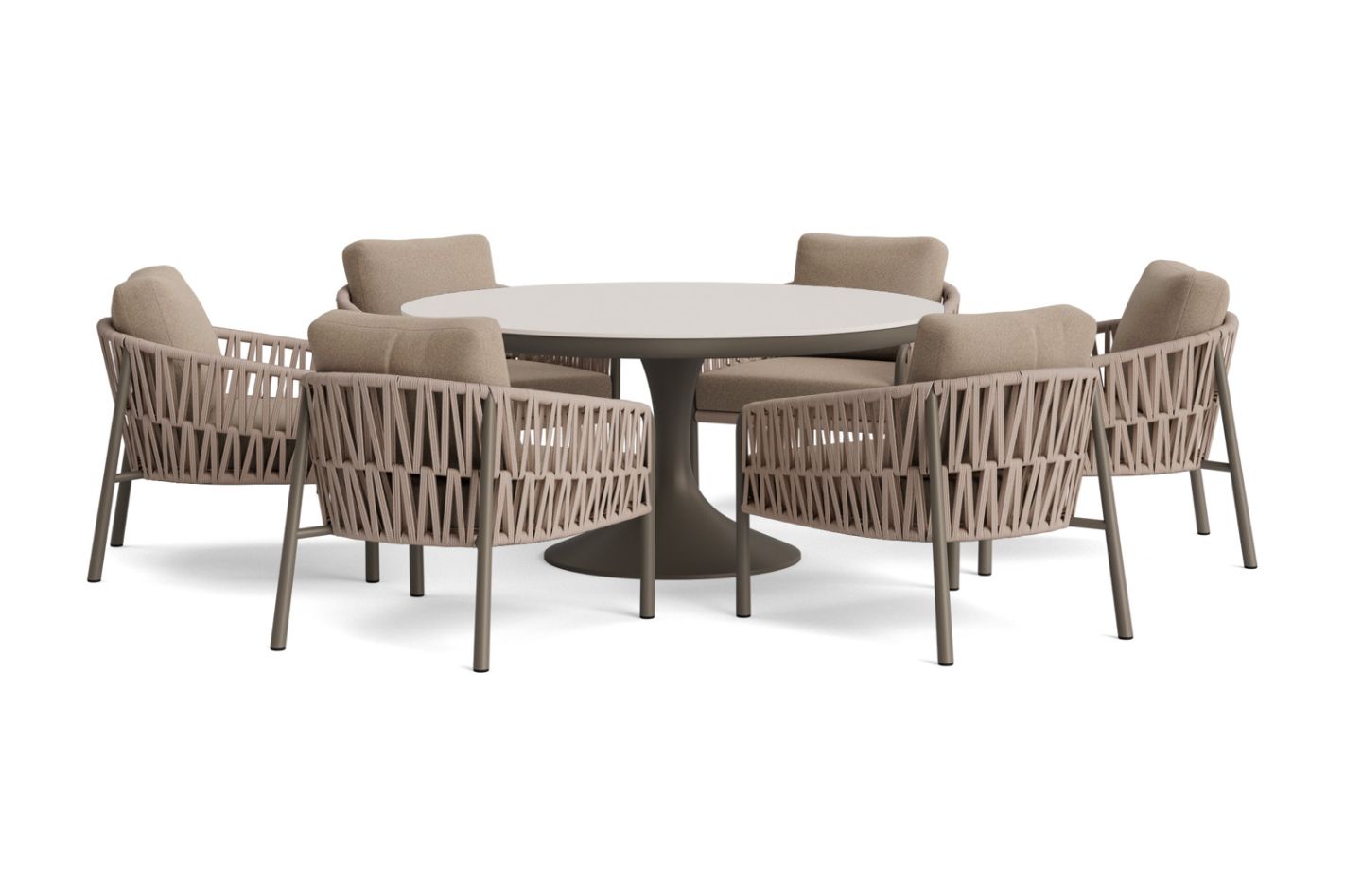 Die Valencia Low-Dining-Gartensitzgruppe vereint weiche Rundungen, warme Farbtöne und feine Handwerkskunst zu einer einladenden Anordnung für das Leben im Freien. Der runde Tisch und die großzügigen Stühle schaffen einen komfortablen Ort, an dem man gerne gemeinsam im Freien speist. Das charakteristische V-Geflecht und die harmonische Farbgebung in Taupe verleihen dem Set eine ruhige, elegante Ausstrahlung, die perfekt zu einem organischen Stil passt, in dem Balance und natürlicher Komfort im Mittelpunkt stehen.