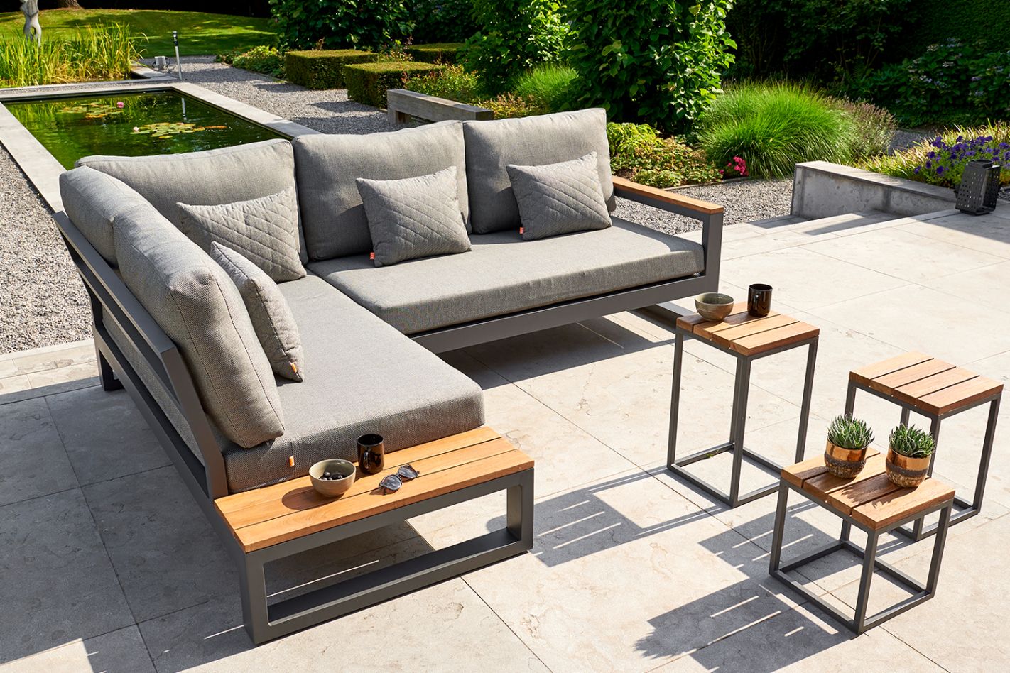 Timeless, versatile lounge set. Sleek profiles, deep seating, and a choice of armrests or side tables (with teak slats).