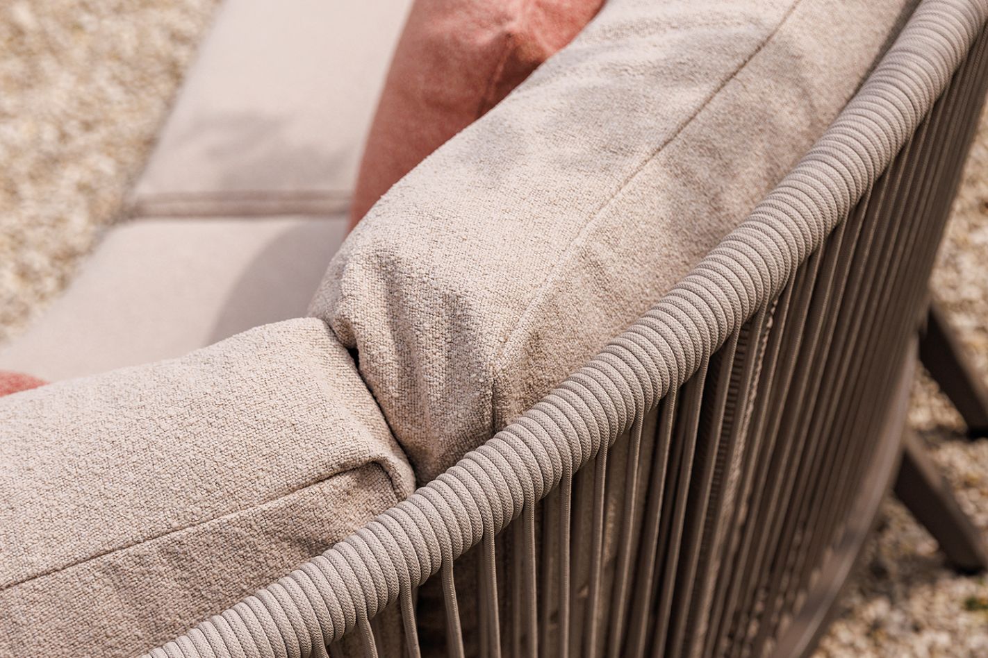 Under the generous cushions lies a textilene sling seat that provides comfortable support. The aluminum frame and RuCore+ rope give the set a stable, high-quality base. A matching side table is available within the same series, so you can easily expand the setup to suit your outdoor lifestyle.