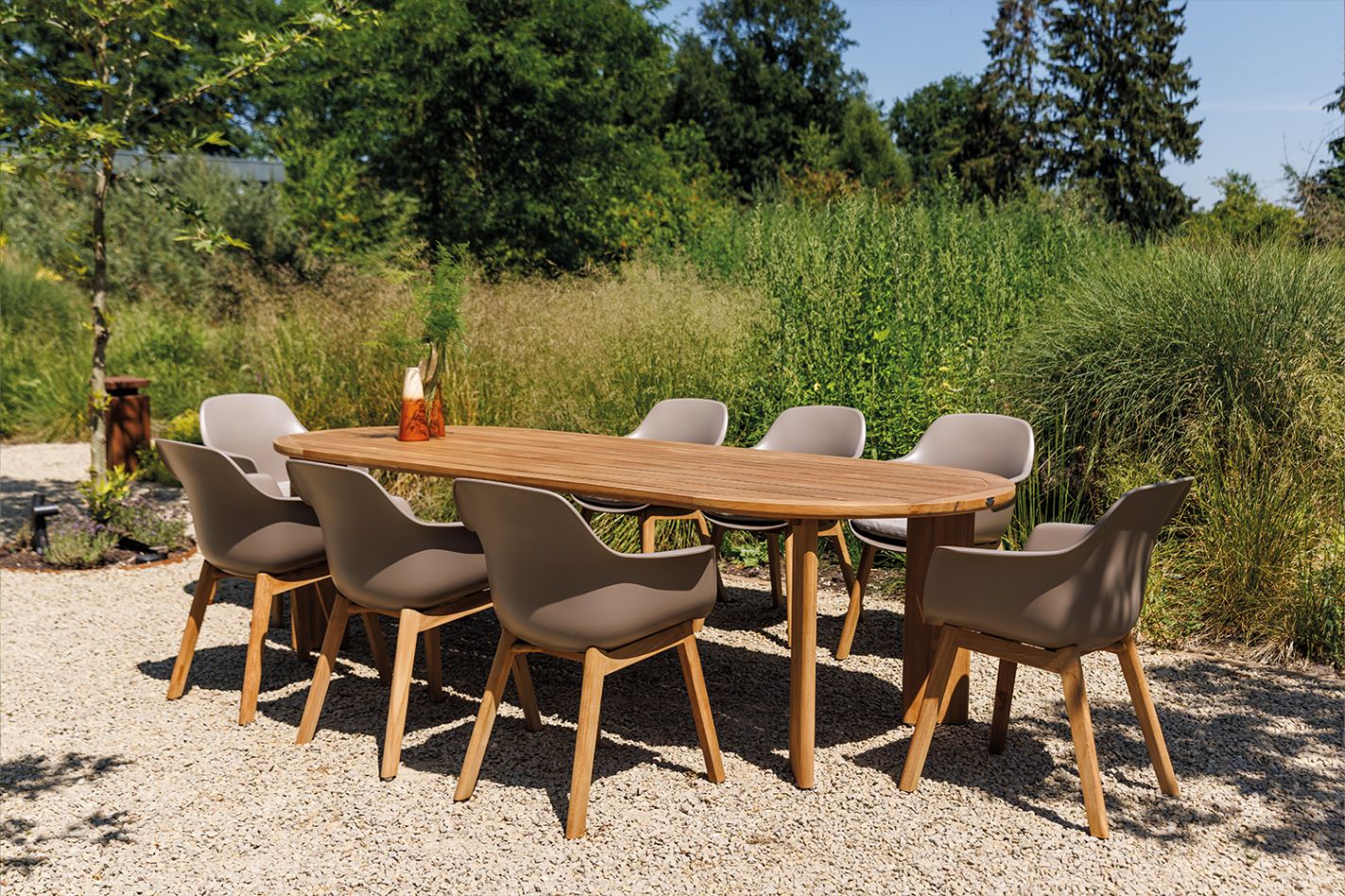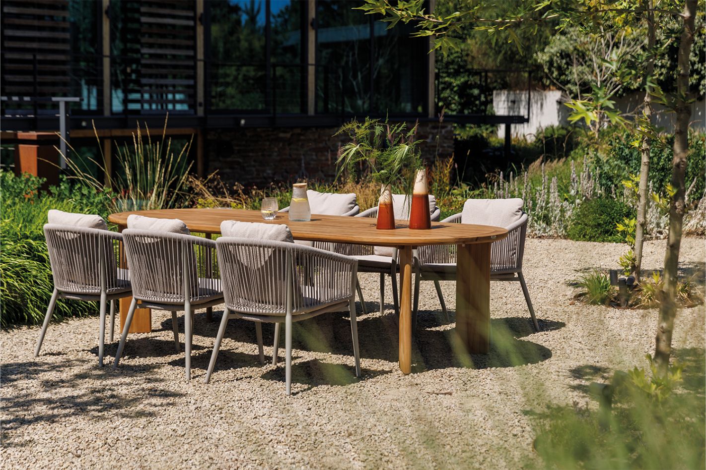 A generous table with a Mediterranean feel. Choose from a solid teak or aluminum frame with a ceramic top.