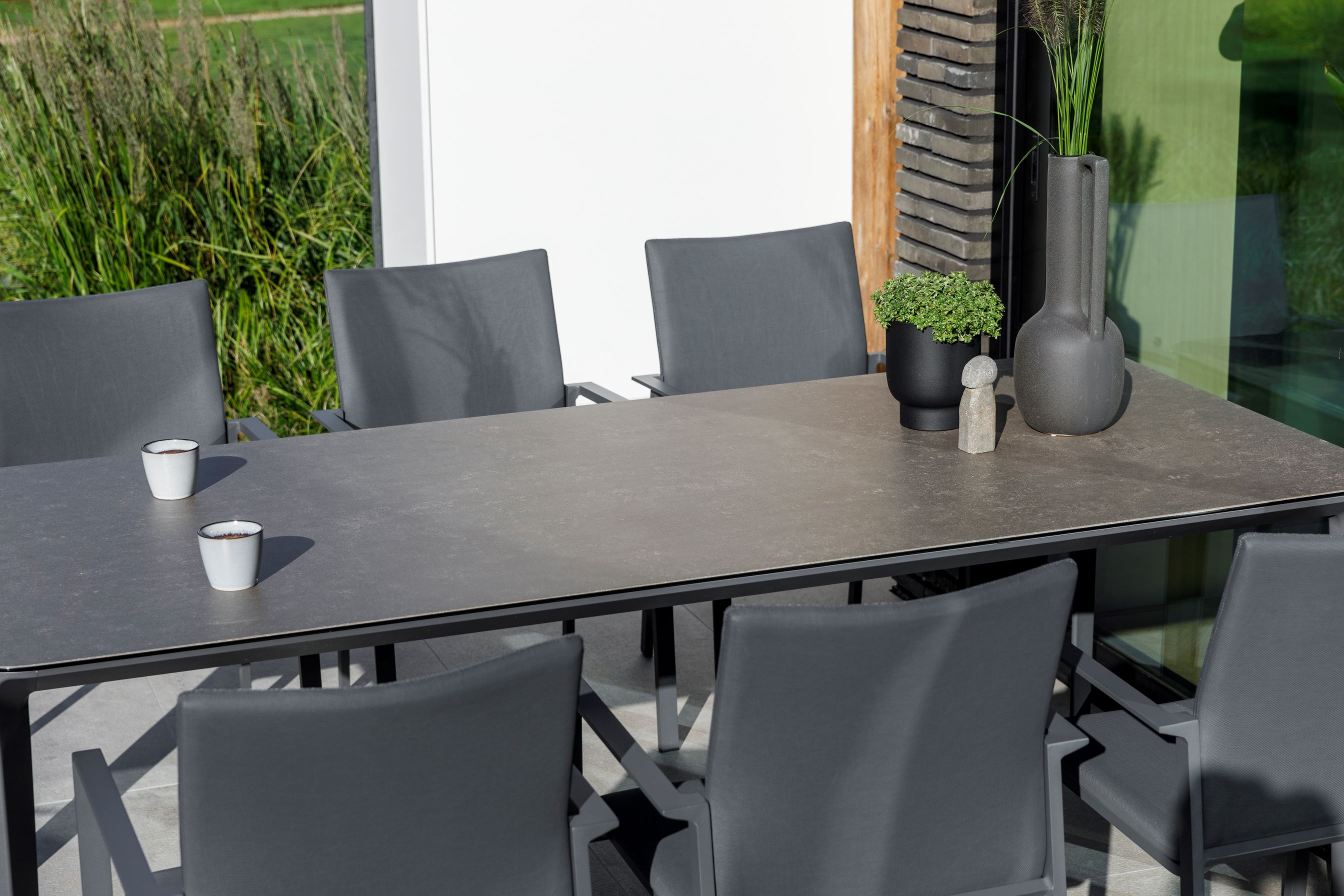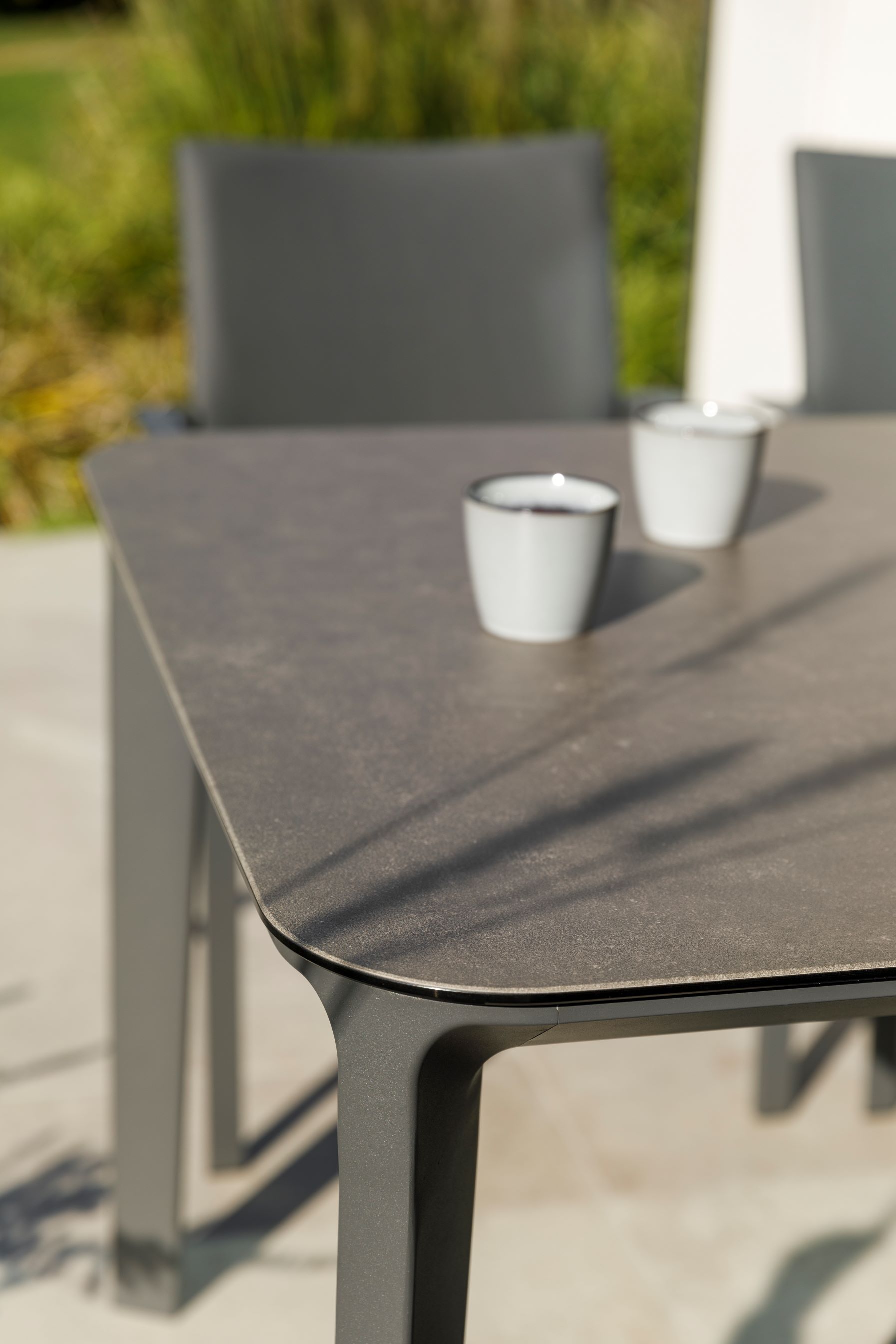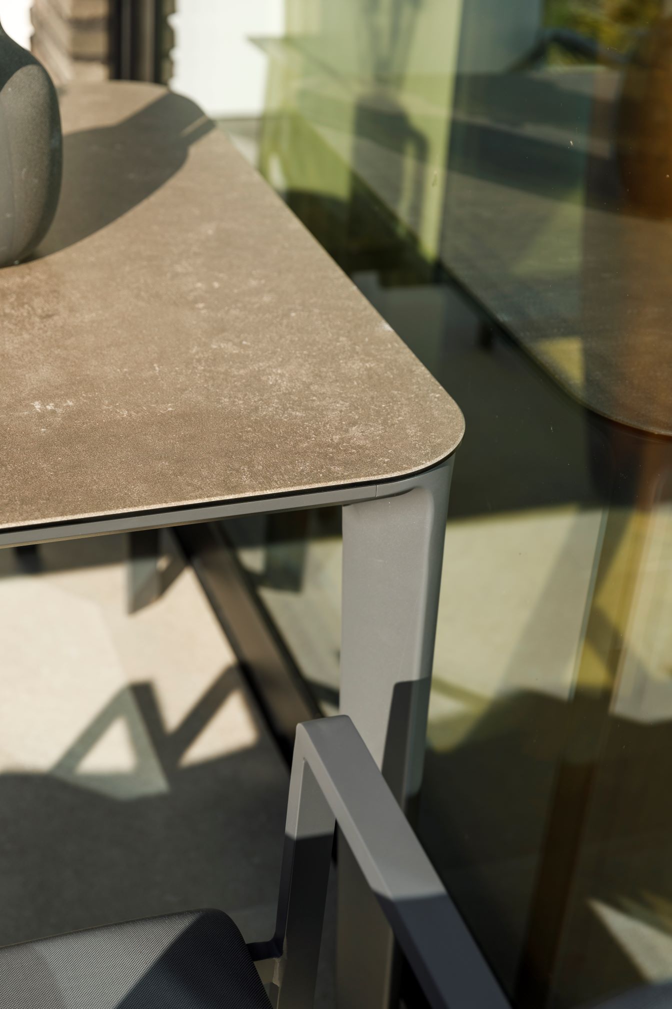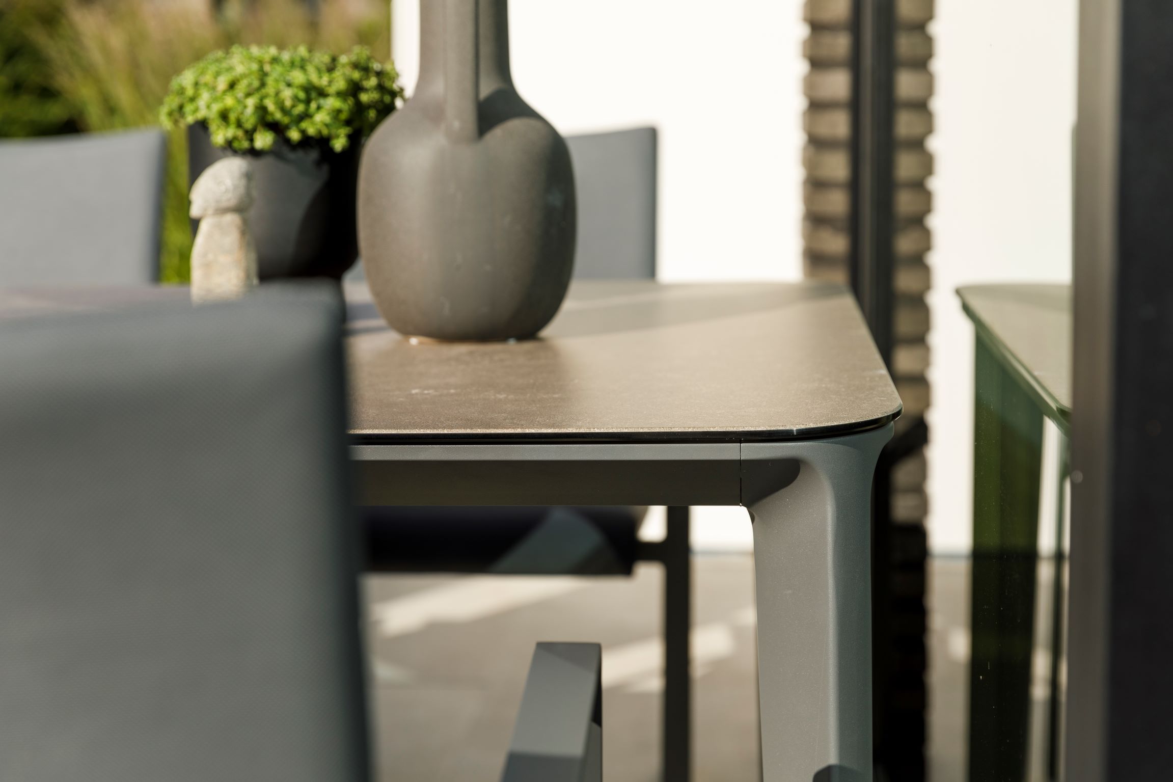 The rounded corners add a touch of softness to the sleek design. Whether you're dining, having drinks or relaxing outside, this dining table offers a chic and functional setting. The grey ceramic top adds a modern and luxurious look to your outdoor space. With high-quality materials and a thoughtful design, the Cordoba dining table is a timeless choice.