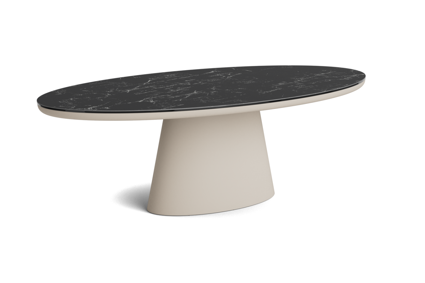 The sleek shape and freestanding legs make the table comfortable to use, as you always have plenty of legroom. The aluminum frame effortlessly stays beautiful outdoors without requiring much maintenance. You can choose between a ceramic top for a modern look or a teak top for a warmer atmosphere, depending on what suits your outdoor moments.