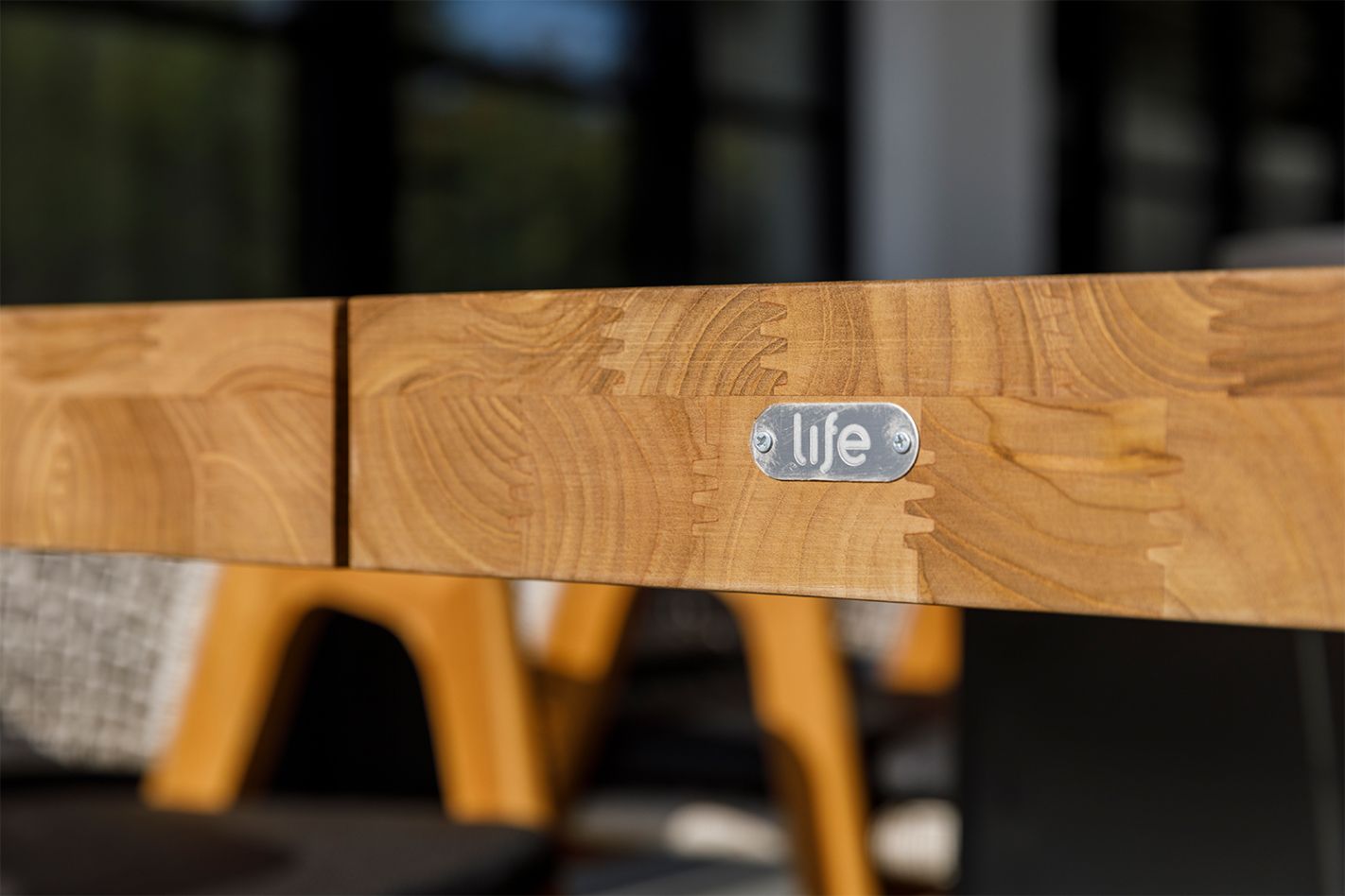 The signature curves of the Fitz Roy are reflected throughout the design – in the tabletop, the legs, and the central beam. This creates a flowing and cohesive look. The thick teak top complements the robust legs and creates a solid and luxurious look, matching the high-quality finish of the Fitz Roy lounge set. All our teak is certified, meaning it comes from sustainably managed forests and meets strict standards.
