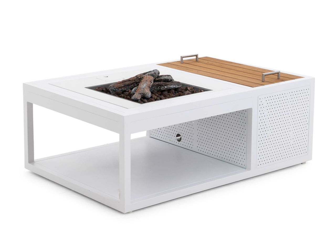 Modern, rectangular fire pit table (aluminum). Gas bottle can be discreetly stored inside the table. Warmth and ambiance.