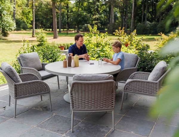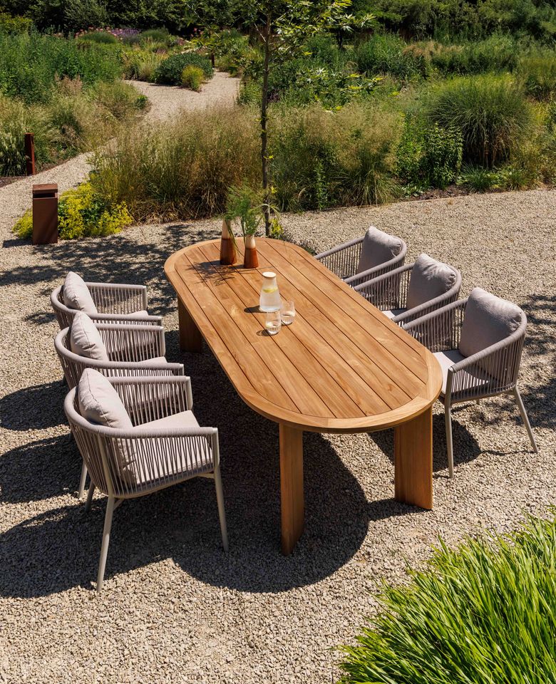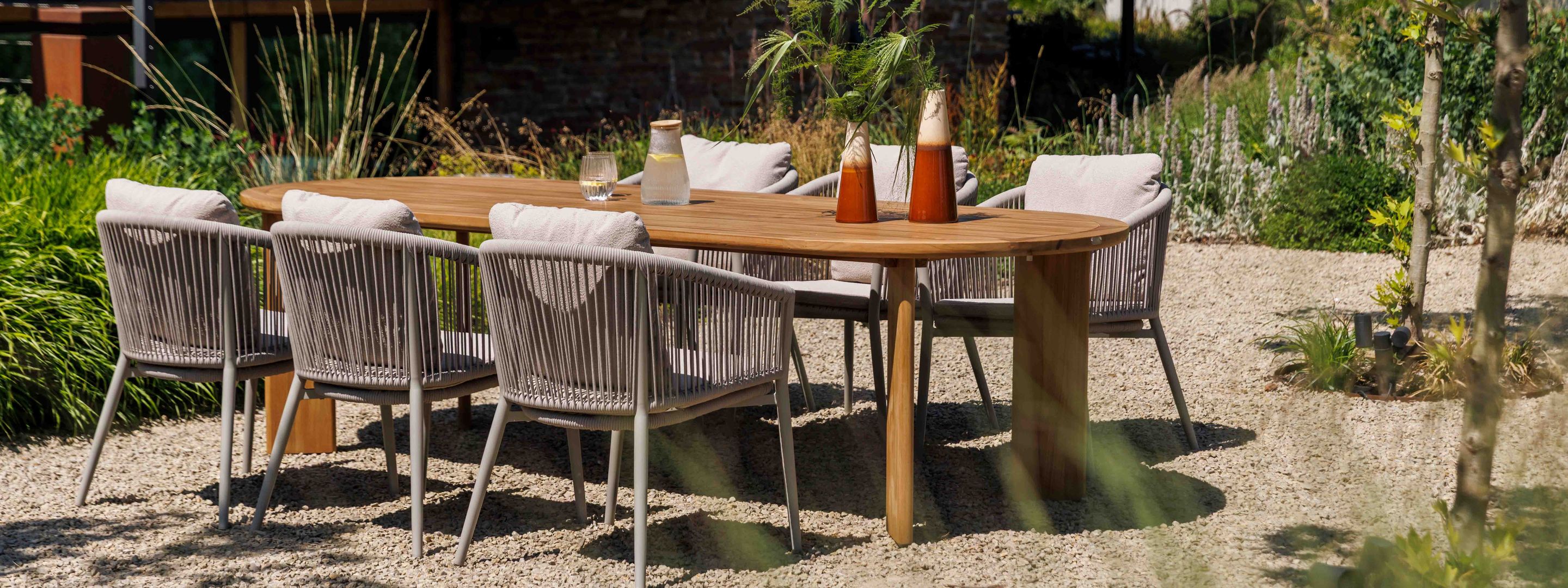 It’s no longer just about the overall shape of your furniture, but the refined details that add character. Rounded frames and woven finishes create a natural, relaxed look. Just take a look at the flowing contours of the Olympus lounge or the Malaga garden chair. Teak also fits this trend perfectly – as seen in the round Andalucia table. The result? An outdoor space that feels friendly, harmonious, and completely up to date.