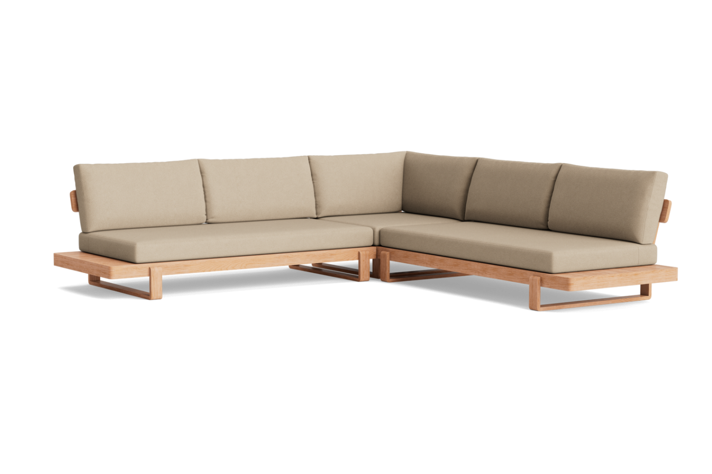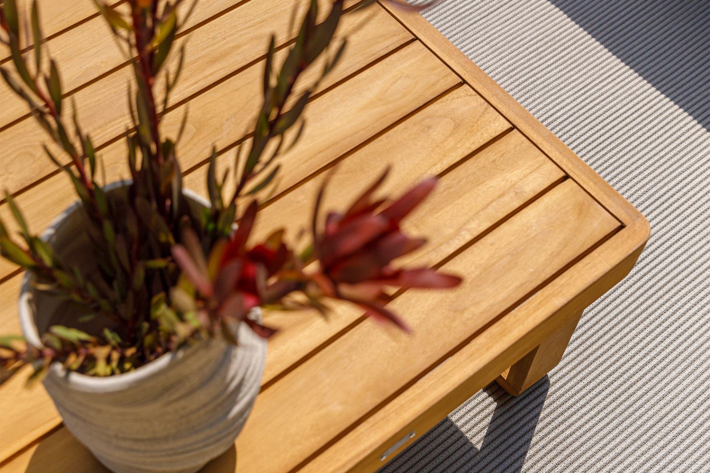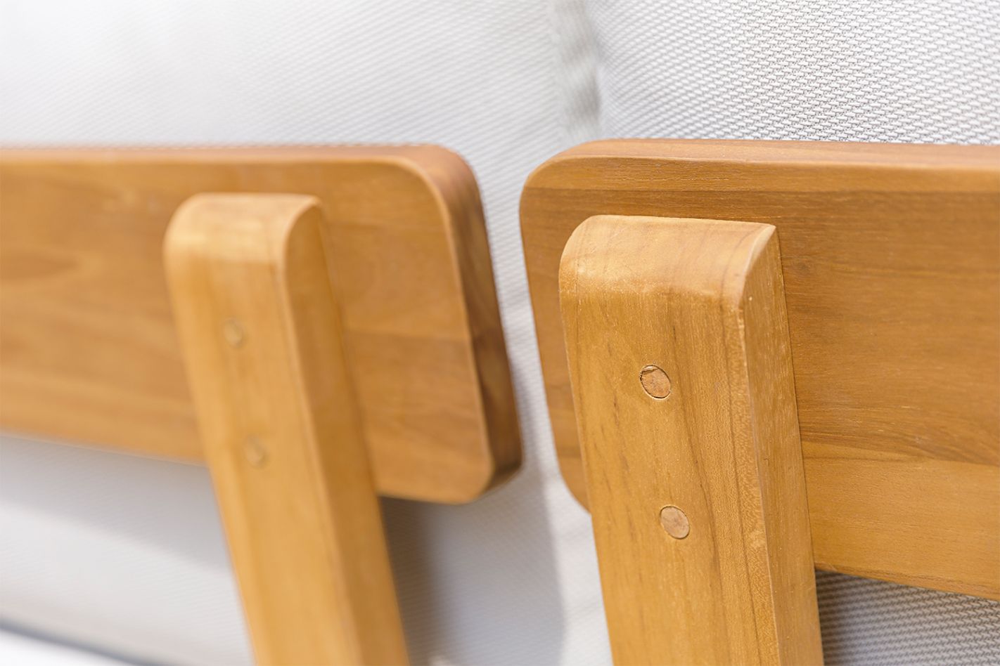 The Jura lounge set capitalizes on the emerging teak trend and combines a warm, inviting look with refined craftsmanship. The rounded details on the back and corners create a soft, inviting design. Crafted entirely from high-quality teak, the set features beautiful woodwork, such as the visible finger joints on the corners. This traditional joining system consists of perfectly interlocking wooden teeth, providing extra strength and an authentic look. This artisanal technique was a deliberate choice because it not only enhances the furniture's character but also ensures extra strength and a longer lifespan.
