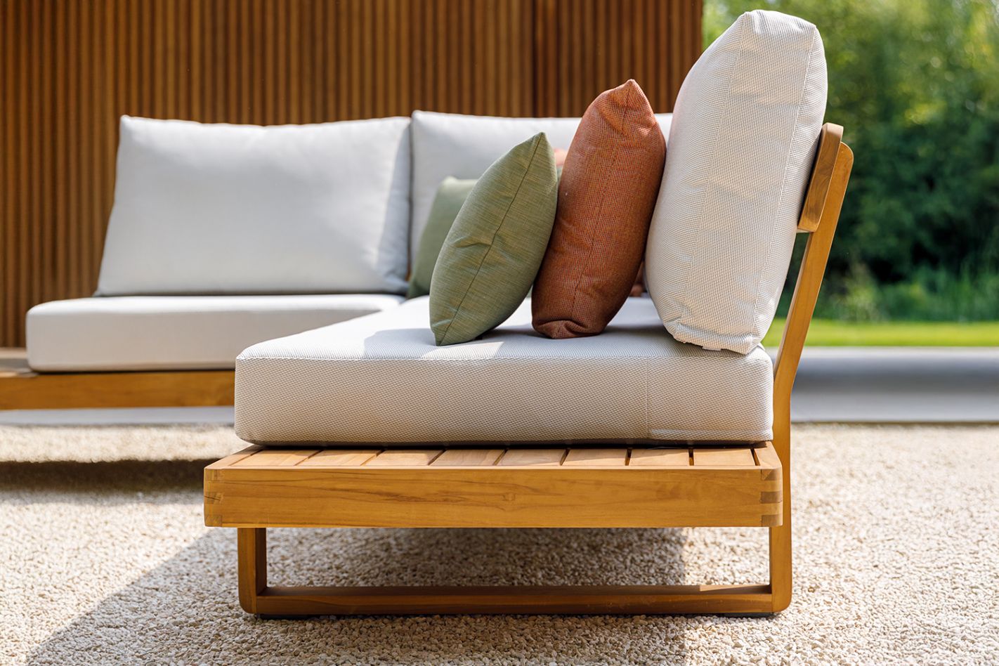 When the cushions are not in use, the Jura Lounge has an airy and stylish look thanks to its open design and elegant teak sled legs. The matching side tables not only add practical functionality but also enhance the set's light and modern design. The tables appear almost to float, as the legs are set slightly inward, creating a refined look.