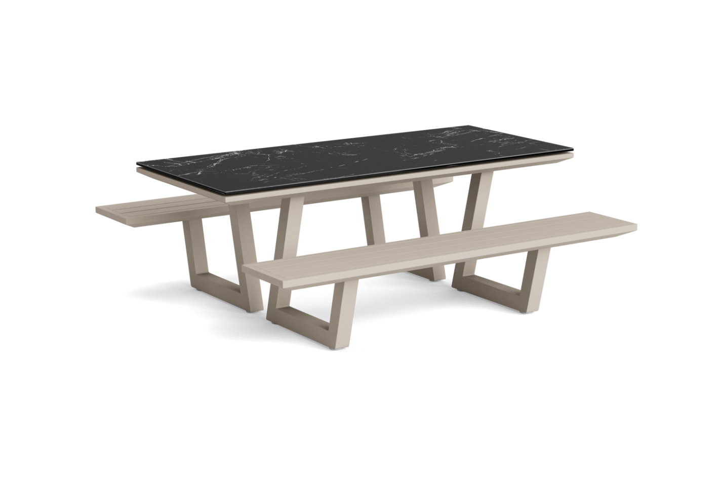 Modern picnic table with a fixed aluminum frame and benches. Choice of ceramic or teak top.