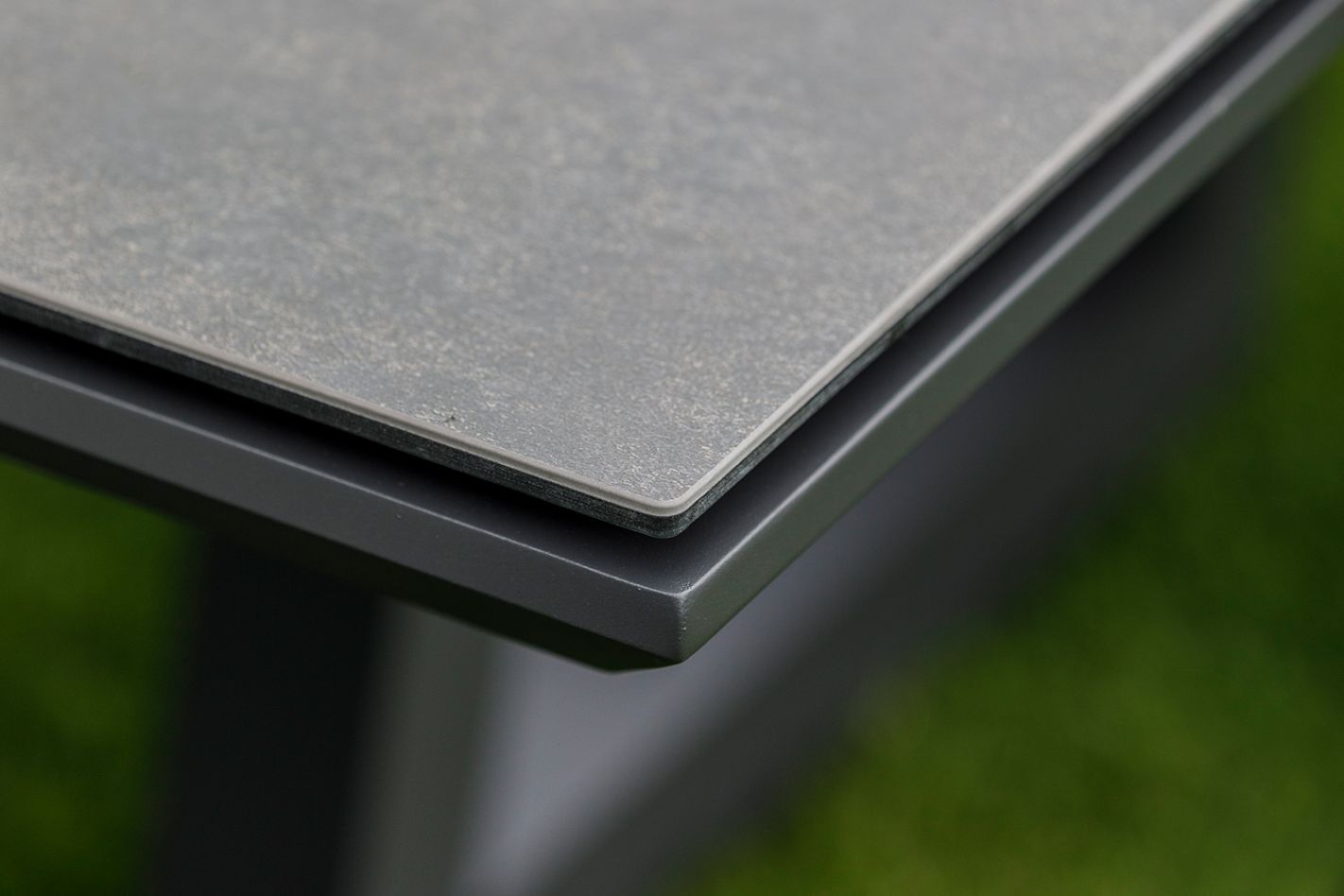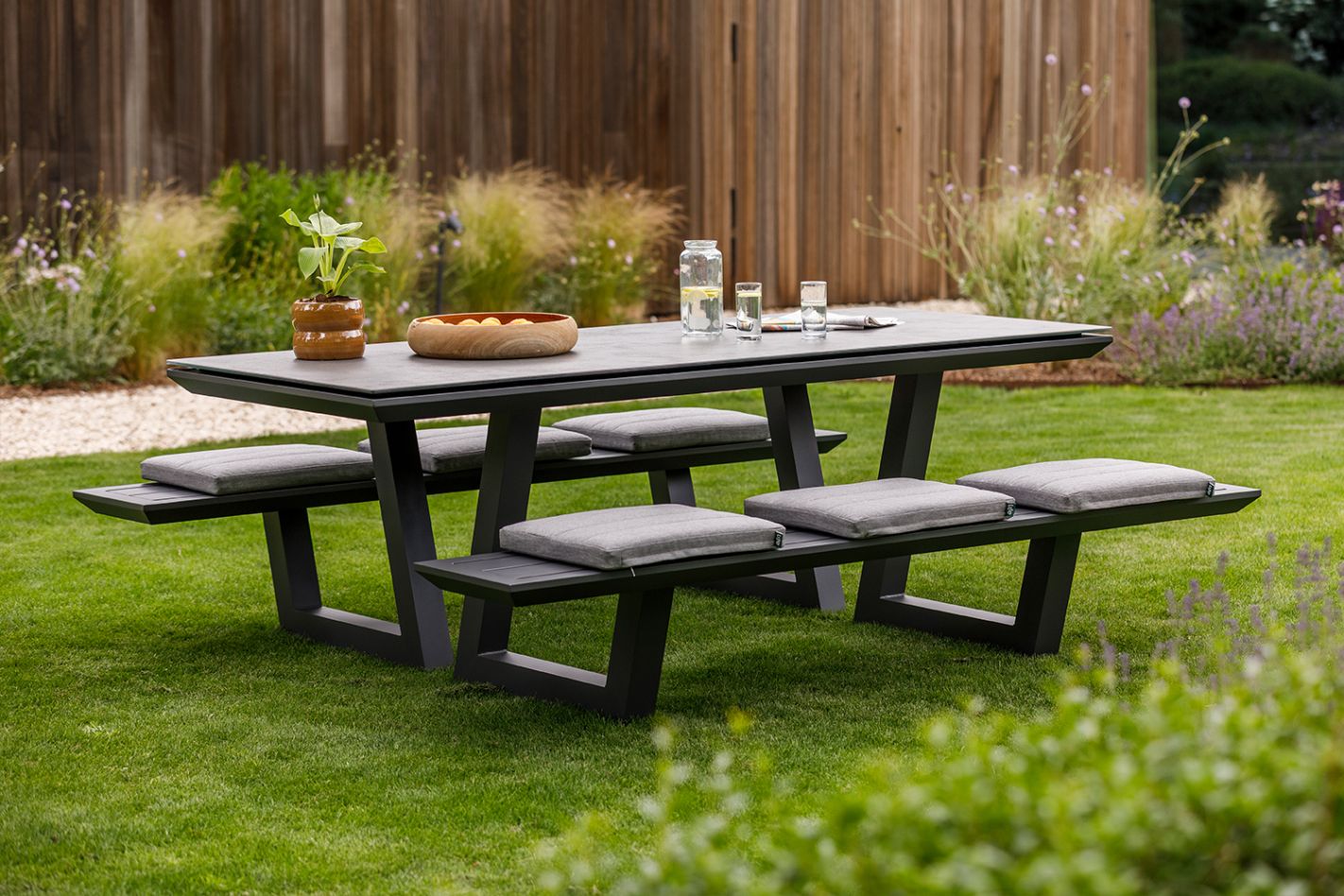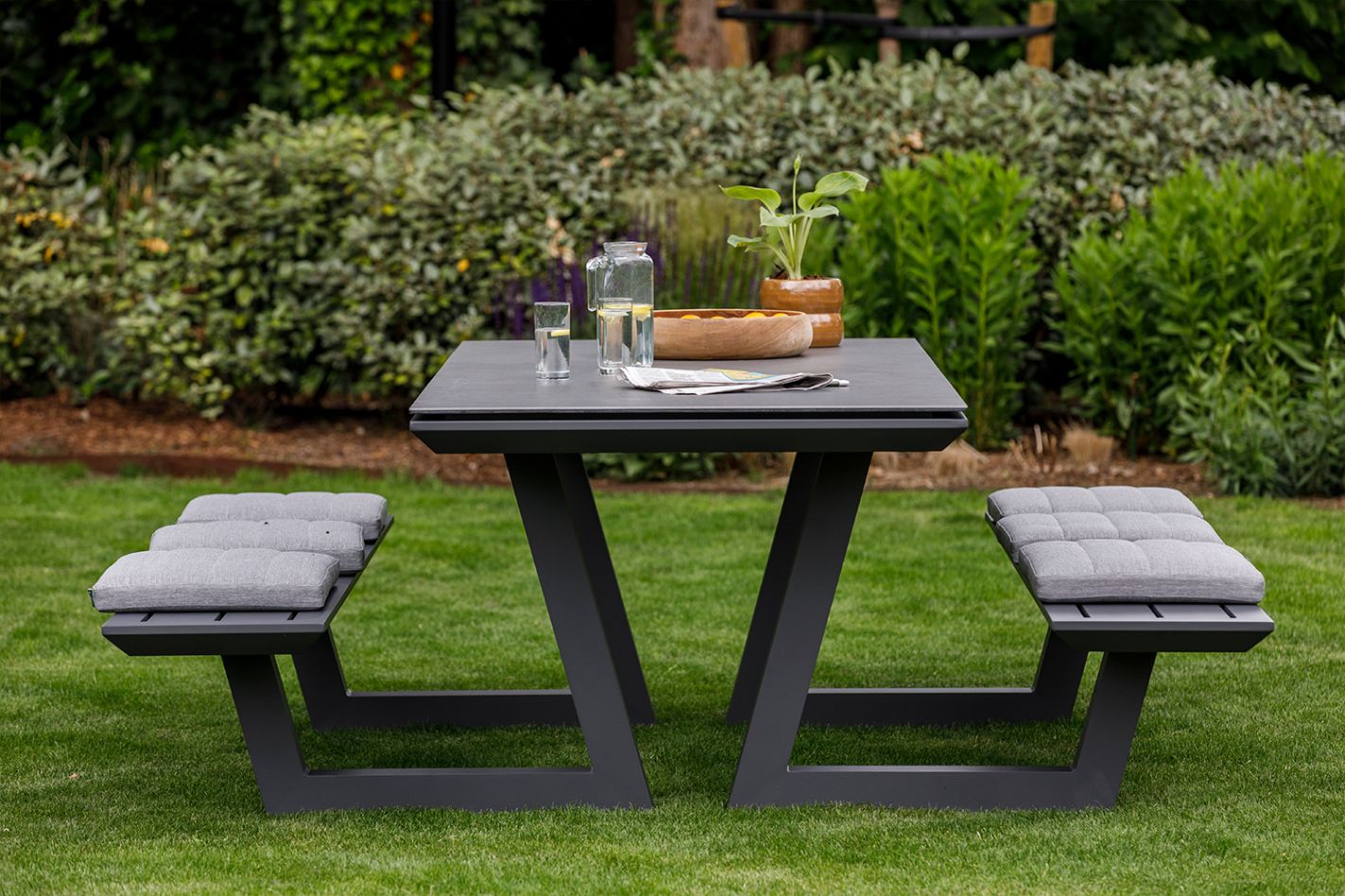 The clean lines and aluminum frame give the table a modern foundation that remains comfortable for daily use. The integrated benches provide stability and make it exceptionally practical: no one has to drag loose chairs around, and you always have plenty of room. The tabletop is available in two styles: a ceramic top for a calm, modern look or a teak top for a warmer, more natural ambiance. The benches are equipped with drainage slots, making them easy to use in various weather conditions.