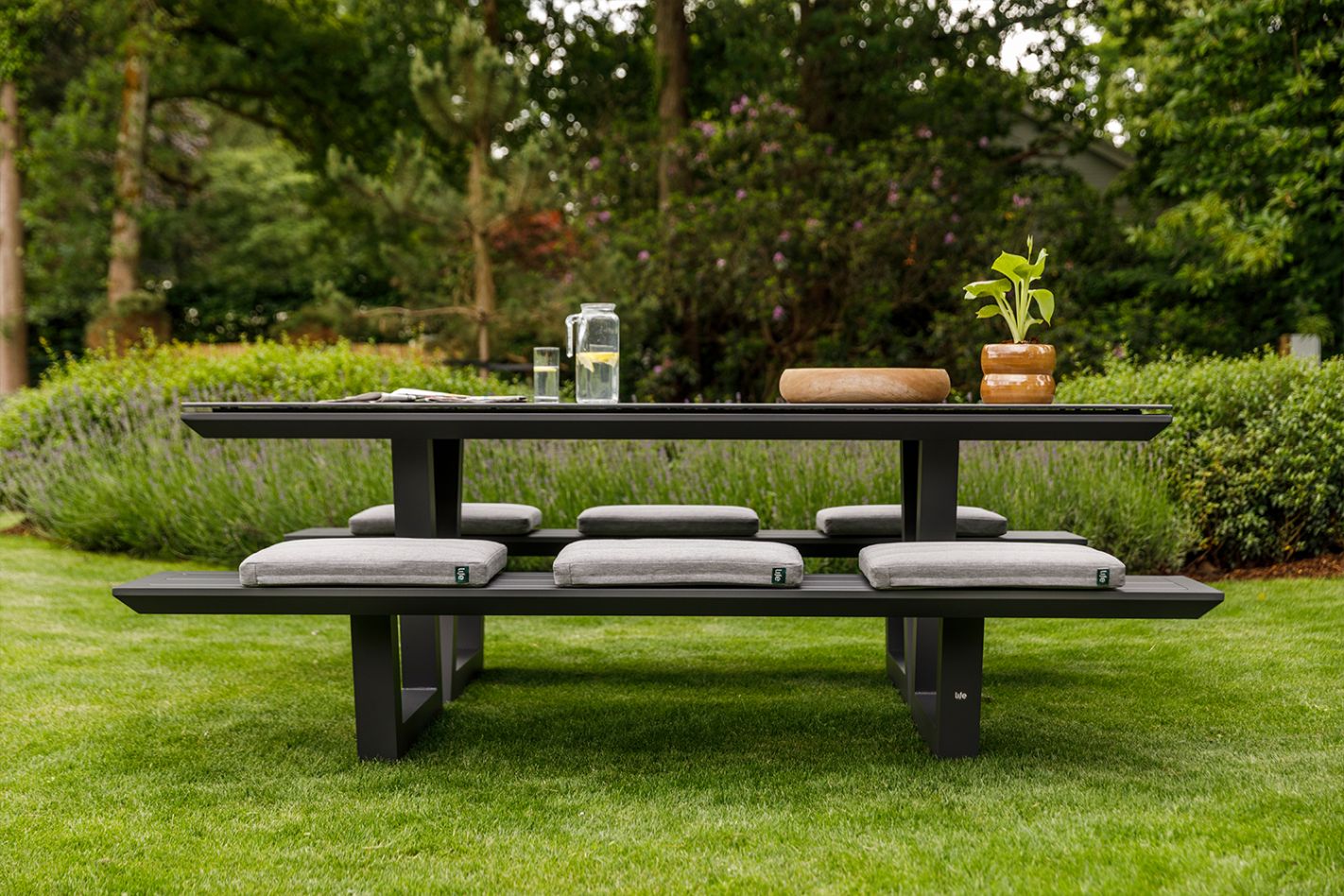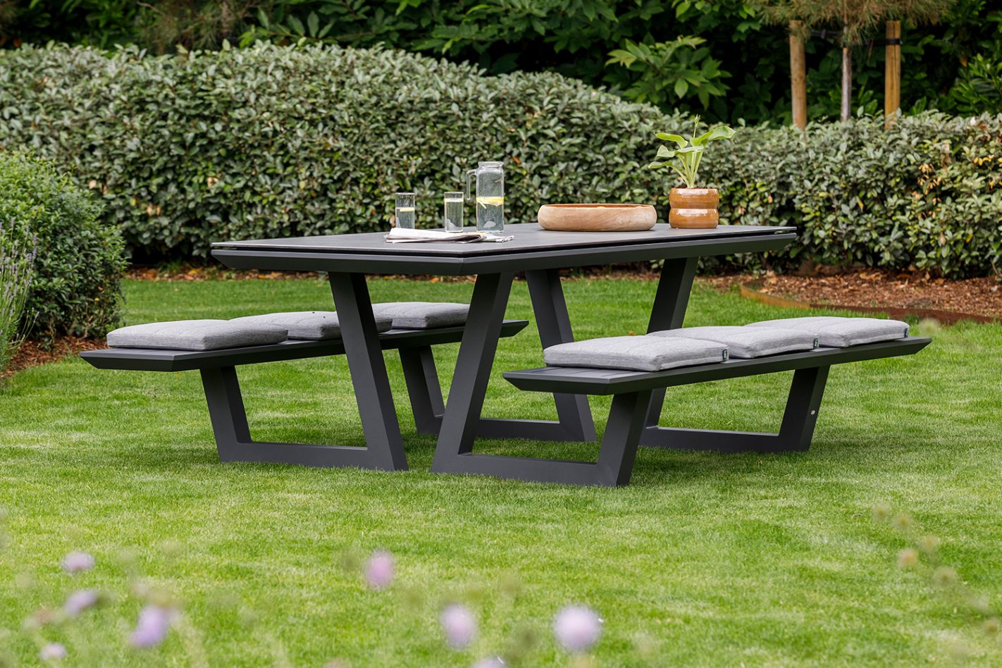 The Lotus picnic table brings a fresh, contemporary look to your outdoor space. The design feels spacious and uncluttered, making it easy to sit down for breakfast in the morning sun, a leisurely lunch, or a relaxing drink. Thanks to the fixed benches, the Lotus creates an inviting spot where everyone is welcome to relax.