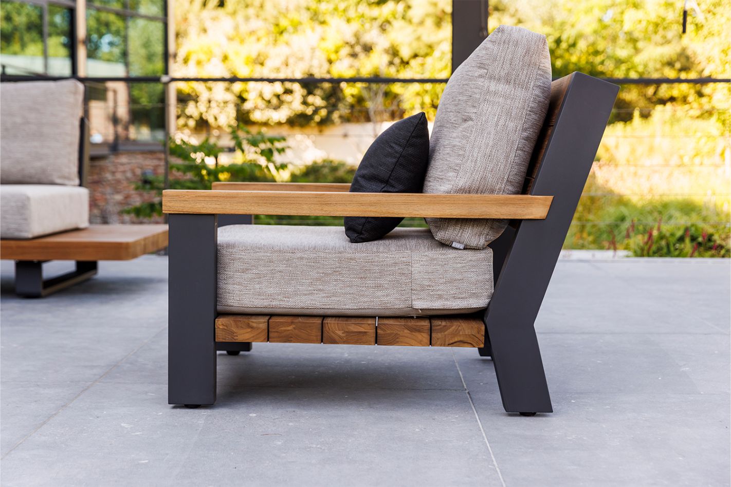 In addition to the sturdy aluminum frame, the Legend lounge chair features carefully placed teak elements in the armrests, seat, and backrest. This not only adds a luxurious and refined look but also makes the armrests extra comfortable to use.