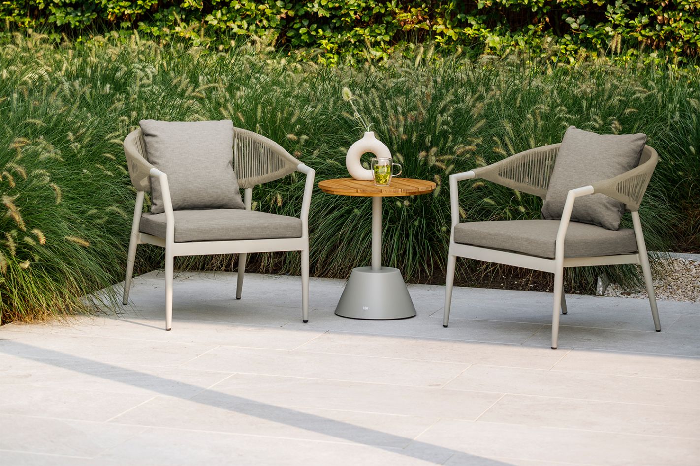 The Sydney lounge chair is a comfortable recliner with a friendly design and elegant rope details. The rope flows from the armrests to the back, creating a playful design and providing extra comfort. Because the rope is partially incorporated into the armrests, the chair feels warmer and more comfortable compared to a cold aluminum profile.